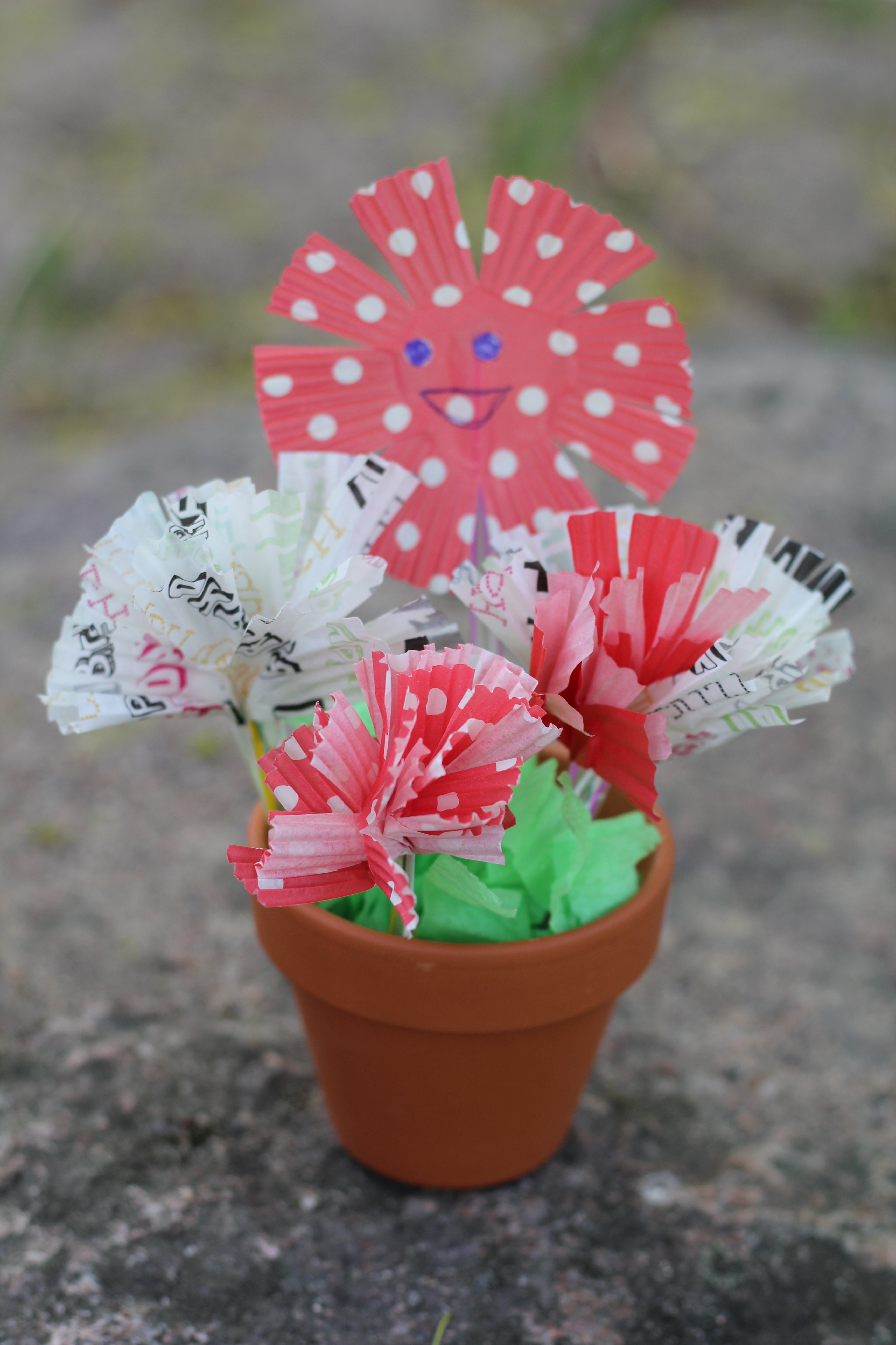sugrörsstump med en bit tejp. De små blommorna gör man genom att vika ihop formen och fästa med häftmaskin i sugröret. Klipp upp två små hack i sugröret så går det enklare att fästa blomman. Till blomstjälk passar även grillpinnar och coctailpinnar, fäst blommorna med tejp. Stick ner blommorna i små vaser eller krukor. Använder du små krukor kan du sticka ner små gröna pappersbitar så hålls blommorna fint i krukan.