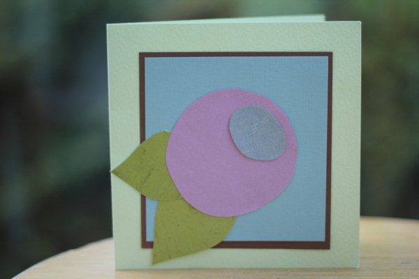 Klipp en fyrkant av det blåa pappret och en lite större fyrkant av det bruna pappret. Limma den bruna fyrkanten på kortbottnen och limma sedan den blåa fyrkanten på den bruna. Rita ett blåbär på lila pappret och två blad på det gröna pappret, klipp ut och limma på