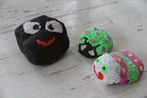 Du behöver: Foam clay-massa, stenar och en gammal tidning som underlag.