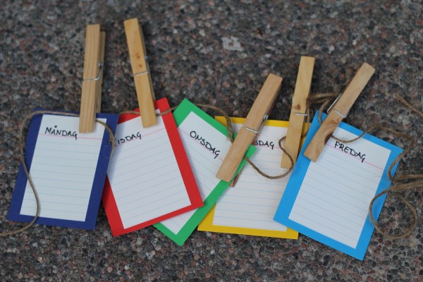 rutor, 5 stycken 8x5cm bitar. Skriv på dagarna och limma det vita pappren på kartongbitarna. Om du vill