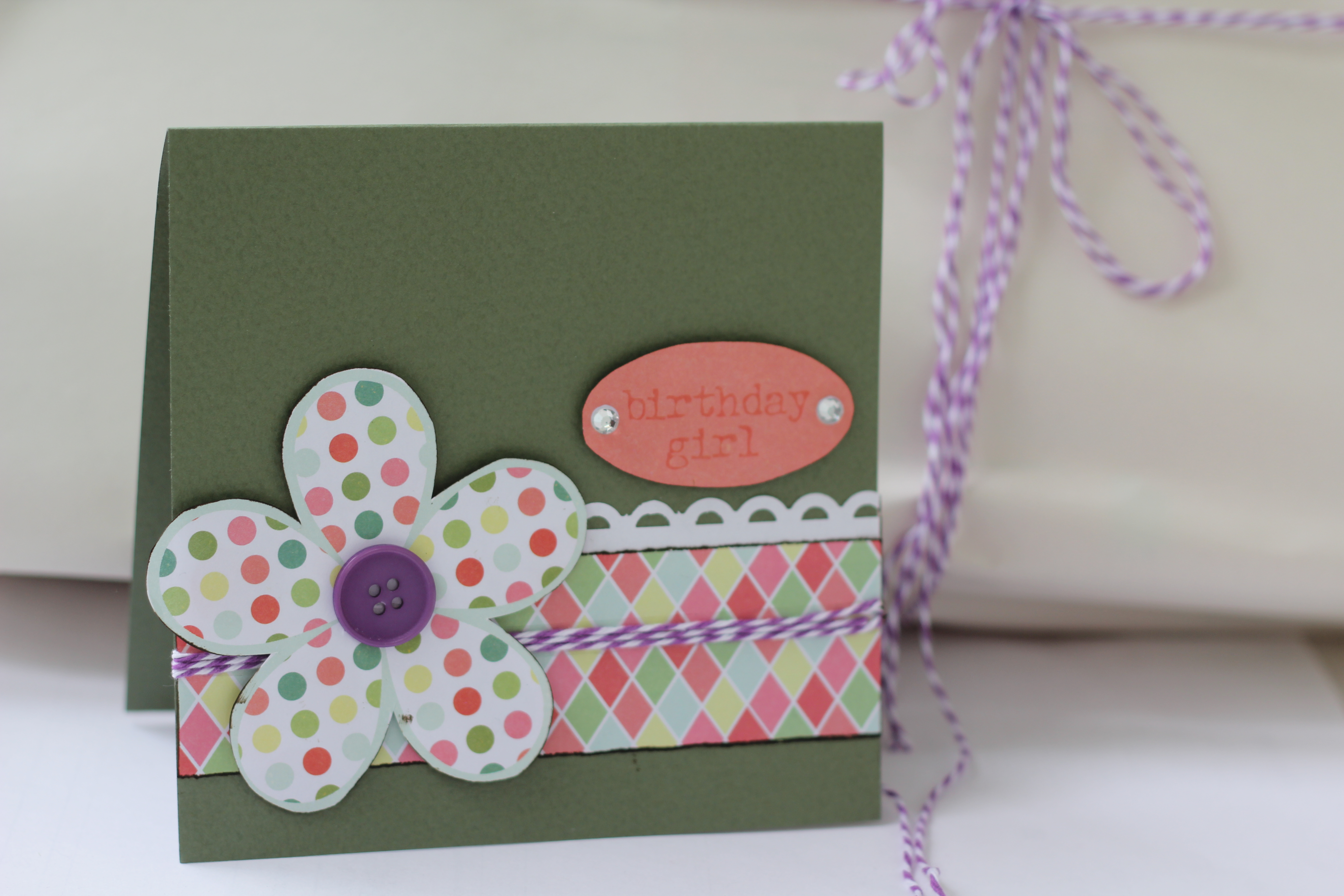 Gör så här: klipp ut en blomma av det färgade pappret eller rita och färglägg en blomma och klipp ut. Dekorera med en knapp. Klipp en ca 3cm bred remsa av rutigt papper eller färglägg ditt eget bakgrundspapper. Klipp en tunn remsa av vitt papper med figursax eller stans och limma på ena kanten av den färgade remsan. Bandet fäster du enklast med dubbelsidighobbytejp. Fäst remsan på kortbottnen. Limma blomman i ena hörnet med limkuddar. Skriv eller stämpla ett meddelande på färgat papper, dekorera med små akryldiamanter och klipp ut. Limma på kortet.