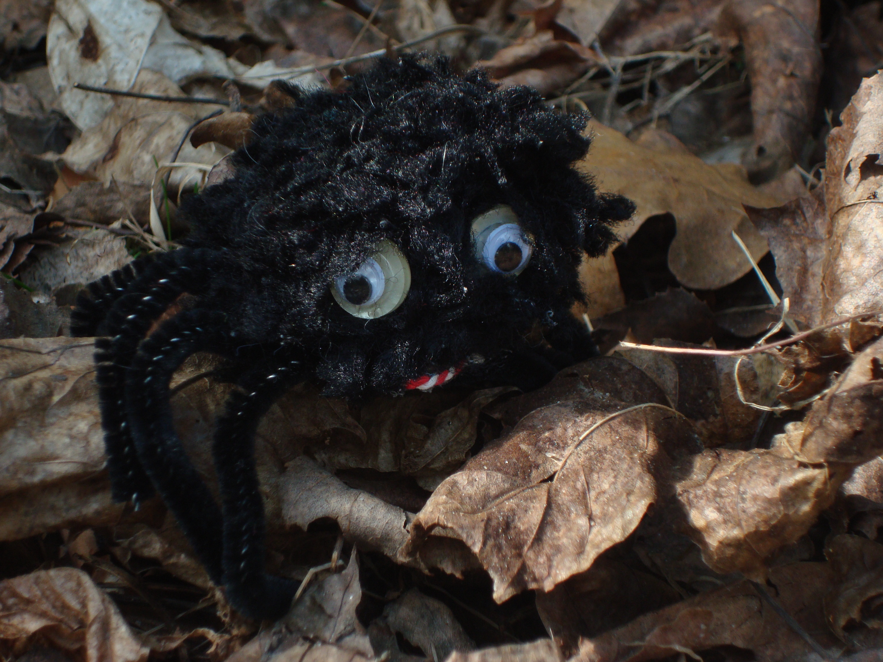 Gör så här: Gör kroppen av det svarta garnet. Gör garnbollen på traditionellt vis med paffrundlar eller med ”tofsrundlar” som finns på marknaden. Klipp de svarta pipränsarna på hälft, så har du åtta ben. Forma till ben, fyra och fyra. Vrid om med lite tråd, så de håller ihop. Knyt fast kroppen. Limma vita knappar som ögon, pupillen kan vara ett pepparkorn eller ”ögon från butiken”. Om du vill kan du limma fast en röd trådstump som mun.