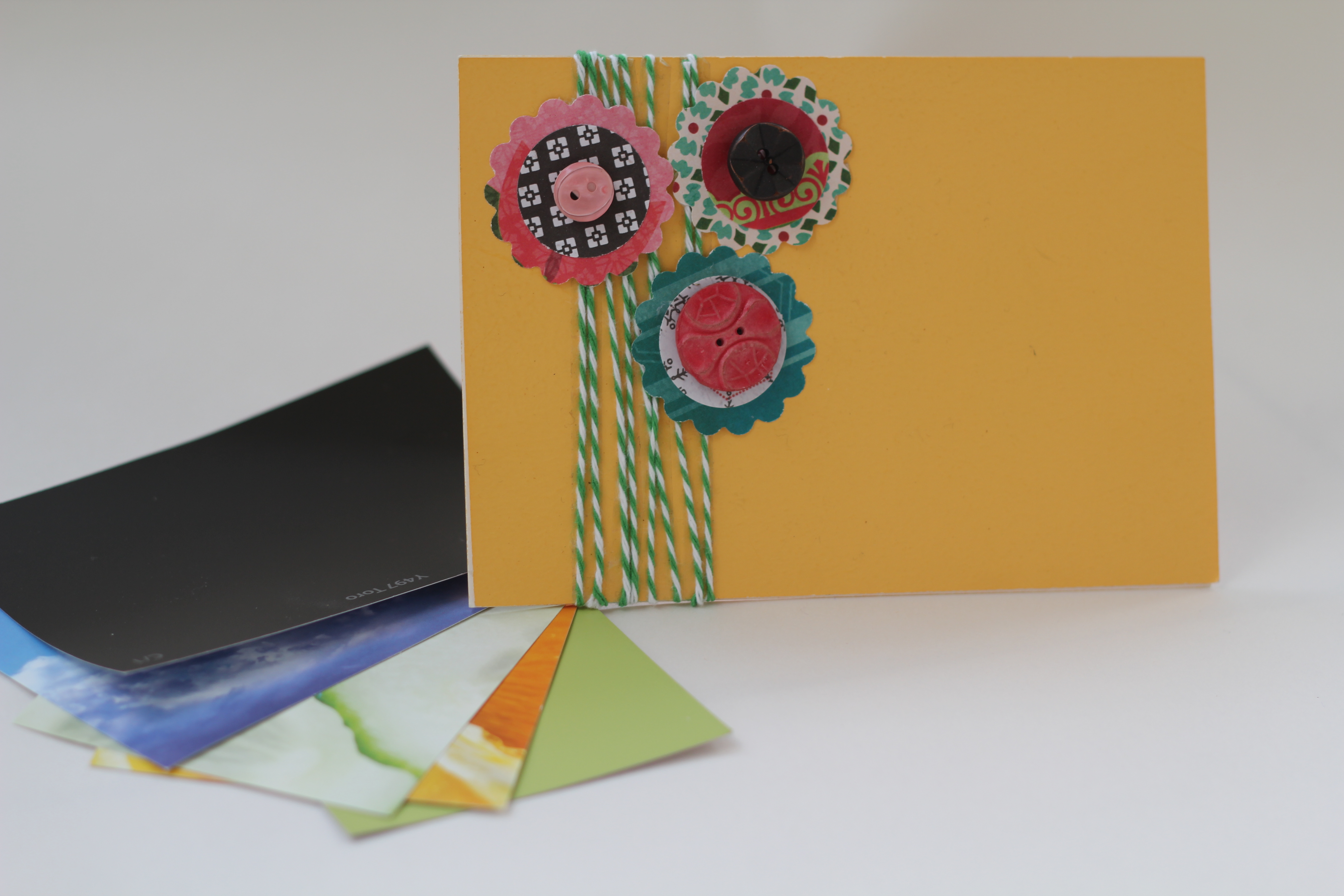 Du behöver: ”målfärgskort”, knappar, papper, snöre, sax och lim.