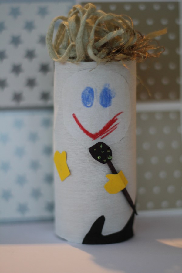 Gör så här: Tygbiten kan med fördel vara lite längre än vad rullen är. Limma fast tyget så att det nedtill är i längd med rullens kant och upptill finns lite extra tyg. (ca 4cm) Pressa in överloppstyget i rullen. På detta sätt får man håret fixat utan besvär. Ansiktet är ritat på bakplåtspapper, vanligt papper går också bra. Händerna är klippta av kartong. Denna pappa vill vara rocksångare! Hans mikrofon är gjord av en stump grillpinne-målad med svart penna och en bit papper som färgats svart och dekorerats med glitter. Det rufsiga rockhåret är av garn, det är bara att mäta upp en tillräkligt lång stump garn och forma som man vill och stoppa ner i tyget. Håret hålls ganska bra utan lim, det går dock bra att fästa med lim.