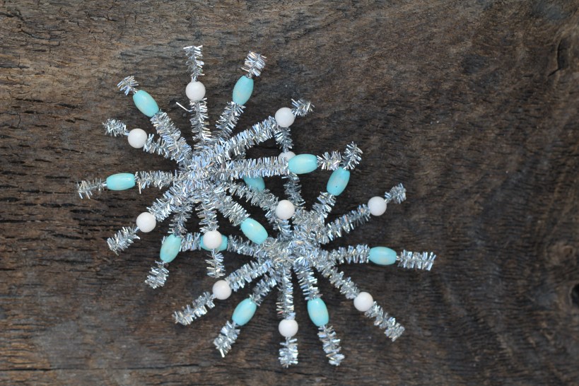 Gör så här: Klipp varje pipränsare i tre lika långa bitar. Vrid dem tvärsöver varandra så att de bildar en stjärna. Trä en pärla på varje udd.
