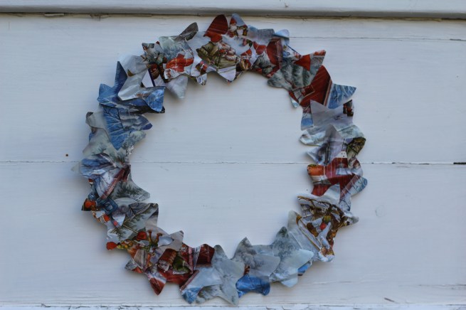 Gör så här: Välj papper, det går bra med återanvändt presentpapper. Klipp ut stjärnor med stans, eller rita stjärnor på pappret och klipp ut. Modellens stjärnor är ritade med hjälp av Fiskars stjärnschablon. Rita upp kransens stomme på kartongen, använd en större och en mindre tallrik som schabloner. Klipp ut. Limma stjärnorna på stommen, tätt och lite omlott.