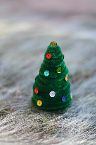 Du behöver: styrox kon, gröna pipränsare, paljetter och lim.
