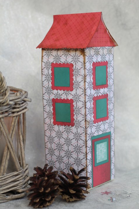 Tarvitset: tyhjän maitopurkin, erivärisiä papereita, sakset ja liimaa. (Leimasintyynyn talon kulmien vanhentamiseen). Ikkunat ja ovet on leikattu Fiskrsin leikkureilla.