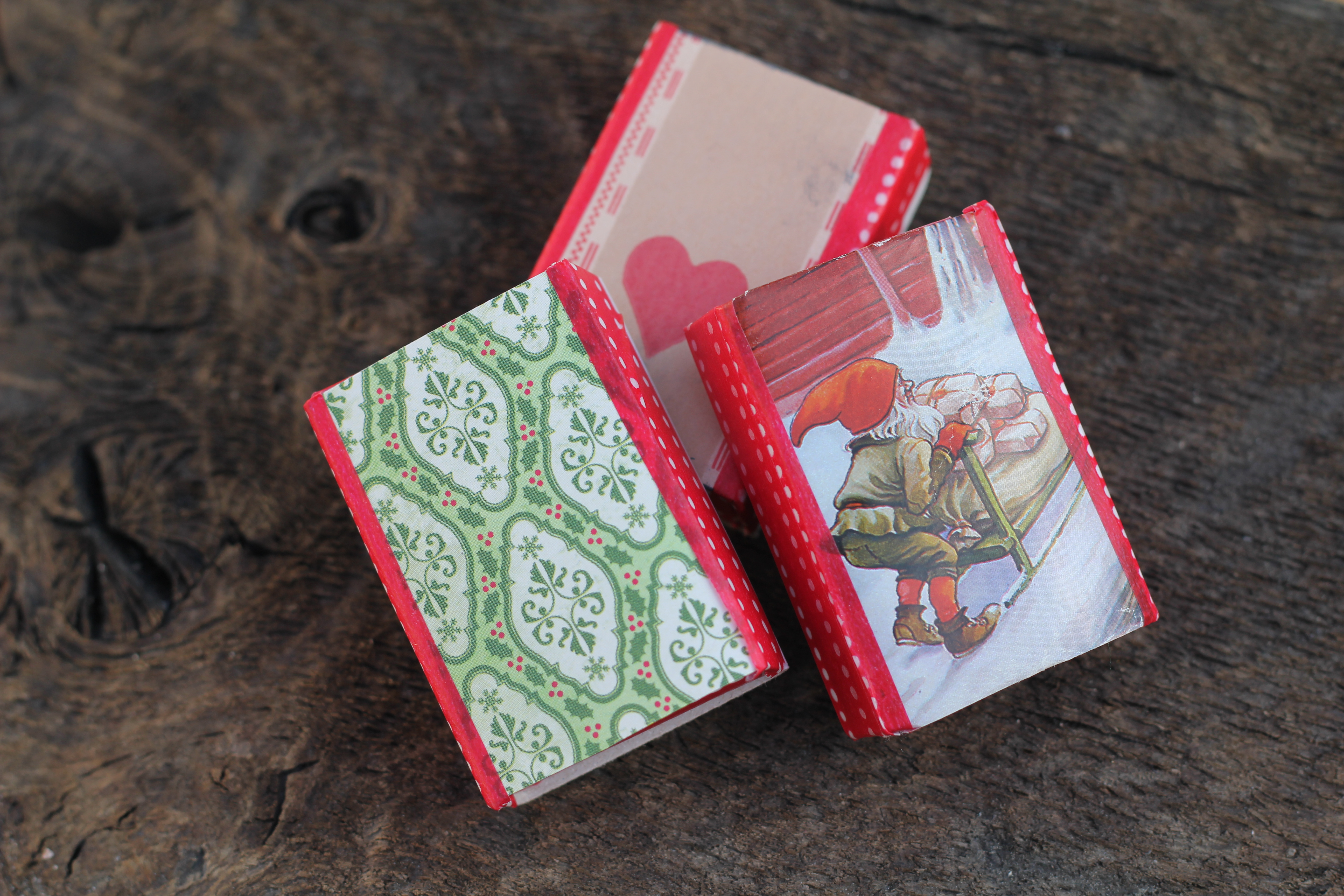 Koristele pieniä ja suuria rasioita. Tavallisista tulitikkurasioista tulee tosi hienot super nopeasti! Tähän projektiin voit käyttää kaikki pienet paperinjämät. Voit myös käyttää lahjapaperia.