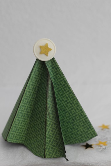 Tee näin: Kuusesta tulee tukeva kun käytät kaksinkertaista paperia. Aseta paperi vaakaan. Taita paperin yläkulmat kohti keskustaa, niin että paperin alaosa jää taittamatta(n.6cm). Taita paperi keskeltä,taitetut kulmat ulospäin. Taita kulmat taaksepäin, ja käännä molemmat puolet kohti keskiviivaa.( Paperi muistuttaa lennokkia).Taita vielä kerran. Avaa varoen ja tasota kulmat saksilla. Kiinnitä kuusen etukulmat liimalla tai kaksipuolisella askarteluteipillä. Viimeistele tuputtamalla mustetta taittokohtiin. Liimaa nappi latvaan ja koristele kultaisella tähdellä.