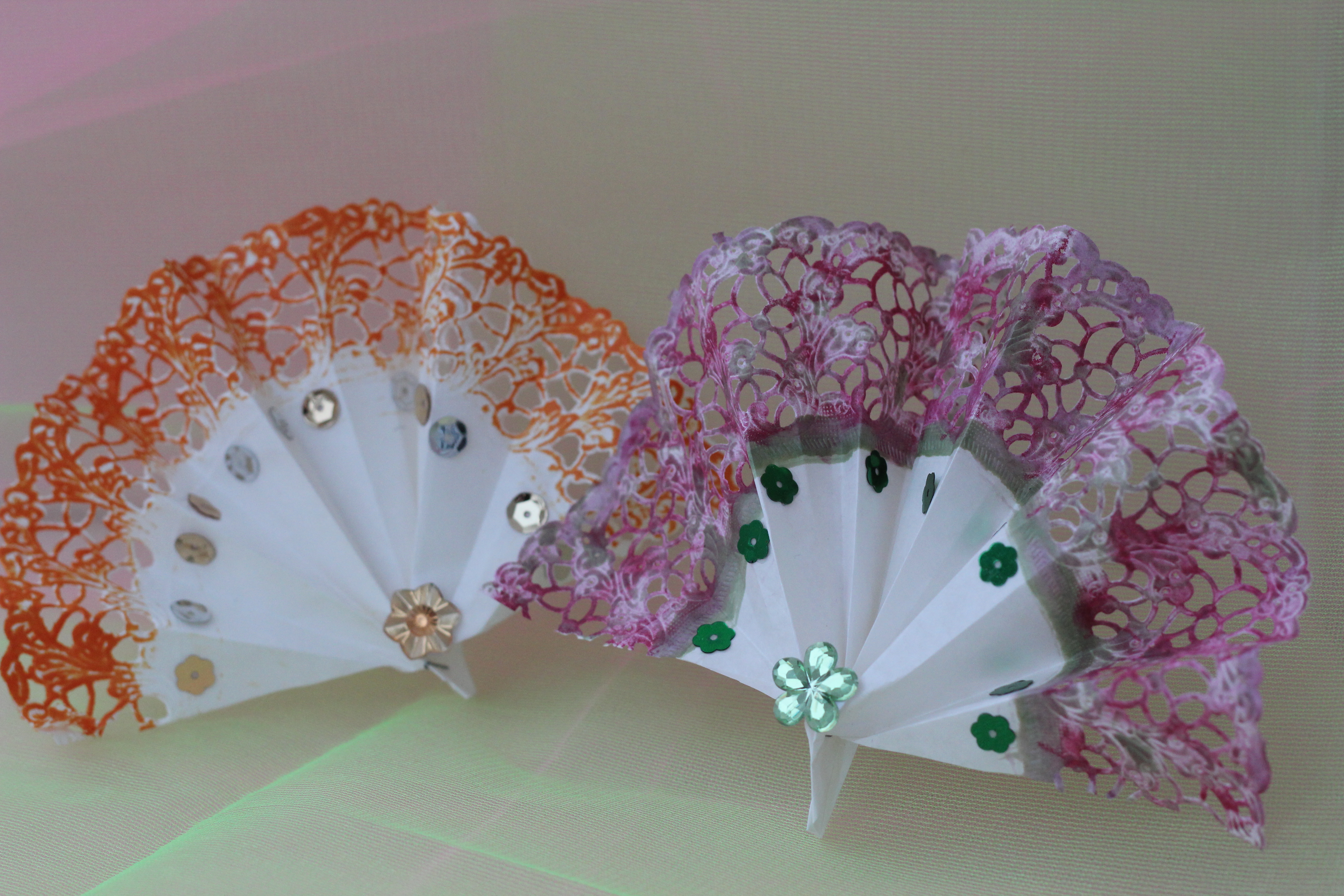 Tee näin: Taita kakkupaperi puoliksi. Väritä reunat, mallin viuhkat on väritetty mustetyynyllä. Voit käyttää kyniä tai , sormivärejä ja vesiverejä. Taita viuhkaksi ja avaa. Nido viuhka niin että taitokset pysyvät. Koristele viuhka.