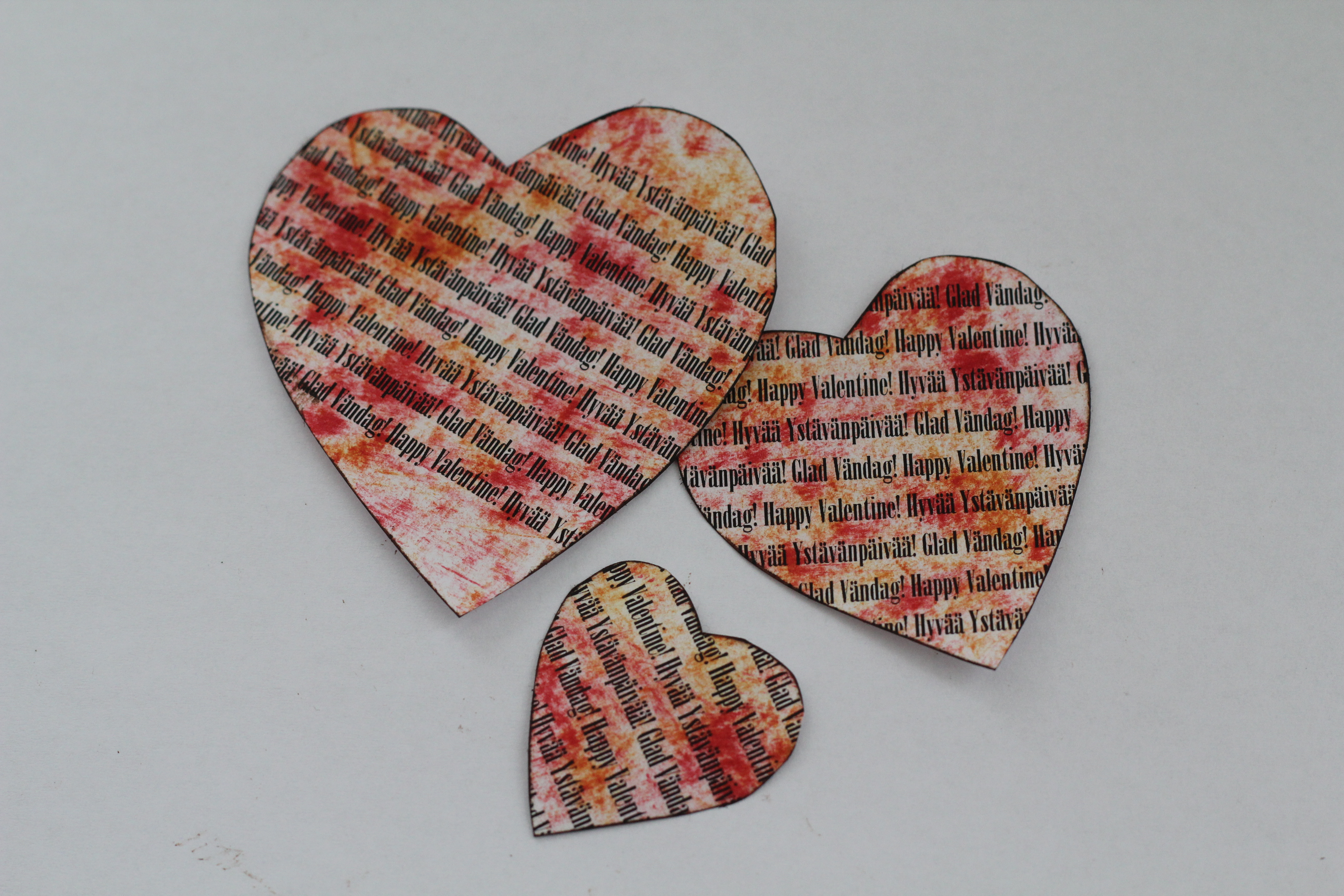 Tee näin: Täytä paperi ystävänpäivä lauseilla. Mallissa lukee: Happy Valentine!Glad Vändag!Hyvää Ystävänpäivää!. Väritä tekstipaperi. Mallipaperi on värjätty kahdella mustetyynyllä, punaisella ja oranssilla. Leikkaa paperista sydämiä, voit käyttää sabluunaa tai piparimuottia apunasi. Leikkaa sydämet paperista ja käytä ystävänpäivä askartelussa.
