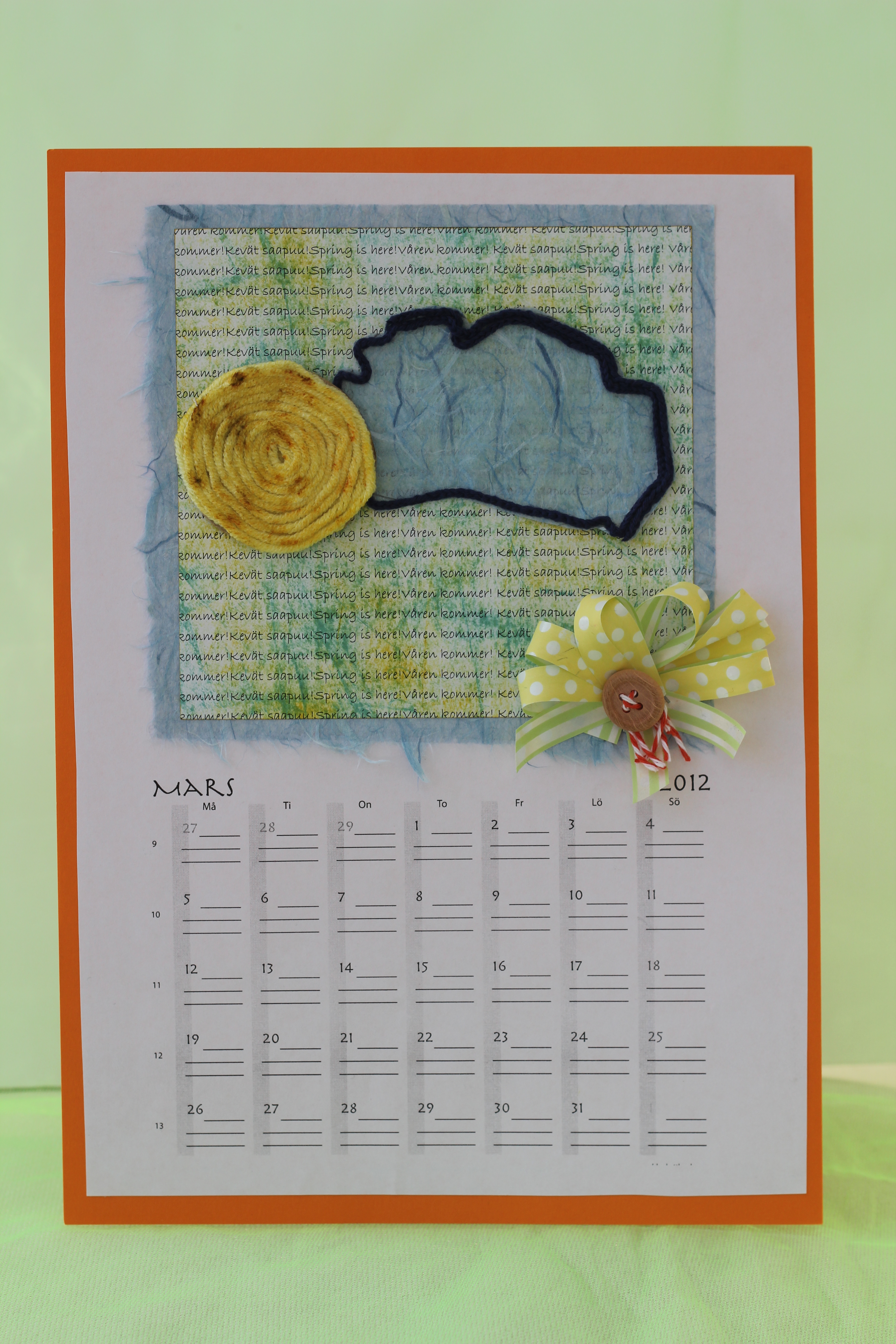 Kaiva esiin lankaa, kartonkia, paperia, pakettinauhaa sekä liimaa ja taiteile keväinen kalenteri sivu. Aurinkoon tarvitset kartonkia, liimaa sekä keltaista lankaa. Kieputa kaksi kierrosta lankaa kartonki ympyrään, niin saat mukhkean auringon. Pilven sininen lanka on ensin virkattu sormin ja sitten liimattu siniselle paperille. Taustapaperissa on teksti Våren kommer!Kevät saapuu!Spring is here!. Paperi on koneella kirjoitettu ja värjätty sinisellä ja keltaisella mustetyynyllä.