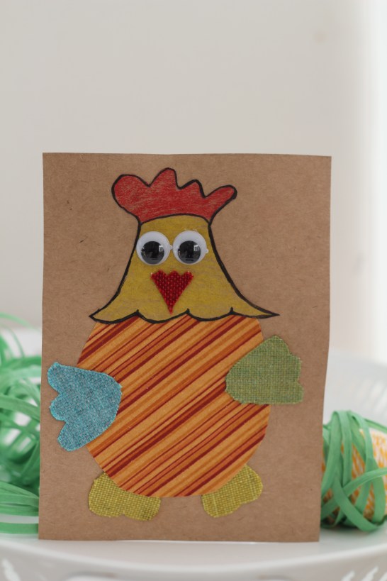 Gör så här: Klipp ut ett ansikte åt tuppen eller hönan, färglägg. Limma på kortbottnen. Klipp ut kropp samt vingar, näbb och fötter av tyg, fäst på kortet. Limma ögon eller rita med penna.