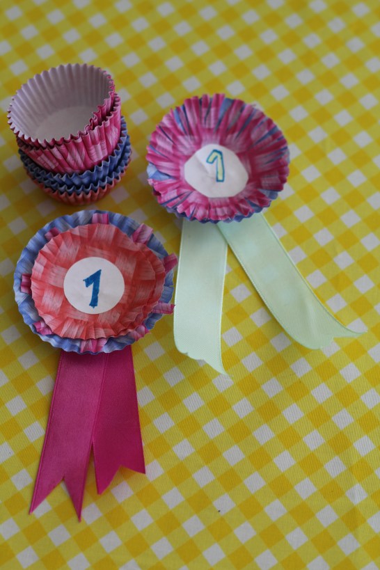 Tee näin: Käytä kolme vuokaa yhteen palkintoon. Leikkaa hapsuja keskimmäisen vuoan reunoihin ja liimaa toisen vuoan päälle. Leikkaa kolmas vuoka hieman pienemmäksi ja liimaa toisten vuokien keskelle. Kiinnitä nauhat palkinnon nurjalle puolelle, nitomalla tai teipillä. Leikkaa pieni ympyrä valkoisesta paperista, kirjoita sijoitus ja liimaa palkinnon keskustaan. Leikki voi alkaa!