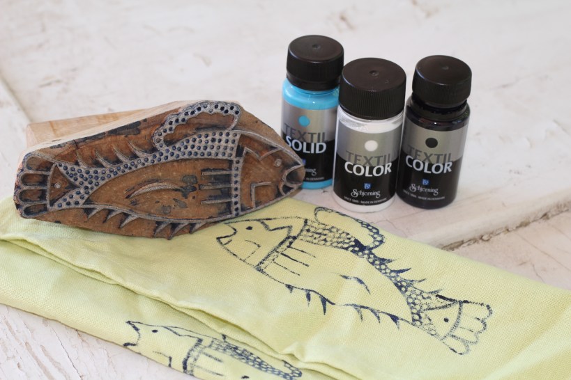 Du behöver: kökshanddukar eller annat tyg att dekorera, stämpel eller pensel och textilfärg. Vi har använt Textil solid, Schjerning. Låt färgen torka och stryk, efter fixeringen kan tyget tvättas i maskin i 40 grader.