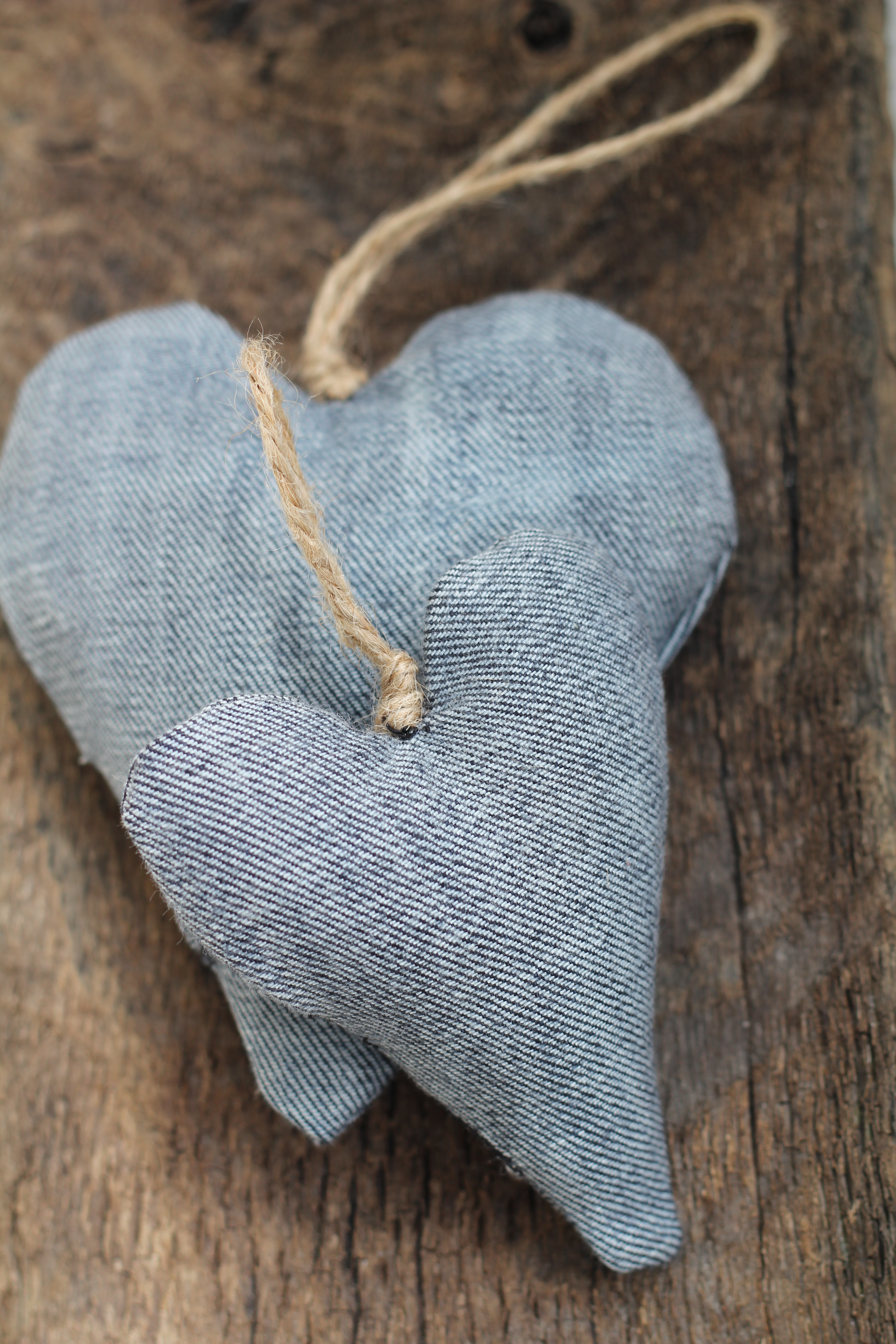 Gör så här: Klipp upp jeansen och rita konturerna till hjärtat på tyget, klipp ut 2 lika delar. Välj vilken sida som skall vara upp och lägg delarna mot varandra, aviga sidan utåt. Sy runt hjärtat men lämna en bit osydd så du kan vända hjärtat och fylla det. Vänd hjärtat och fyll det. Sy fast öppningen och sy fast ett band för upphängning.