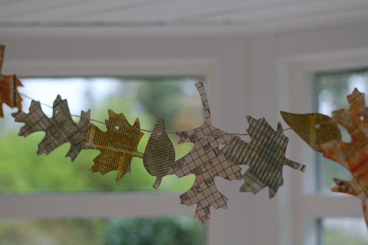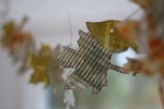 Gör så här: Rita löv på tidningssidorna och klipp ut. Modellens löv är ritade med hjälp av Fiskars blad schablon. Gör ett hål för upphängning och färglägg med t.ex. vattenfärg. Trä löven på snöret och häng upp.