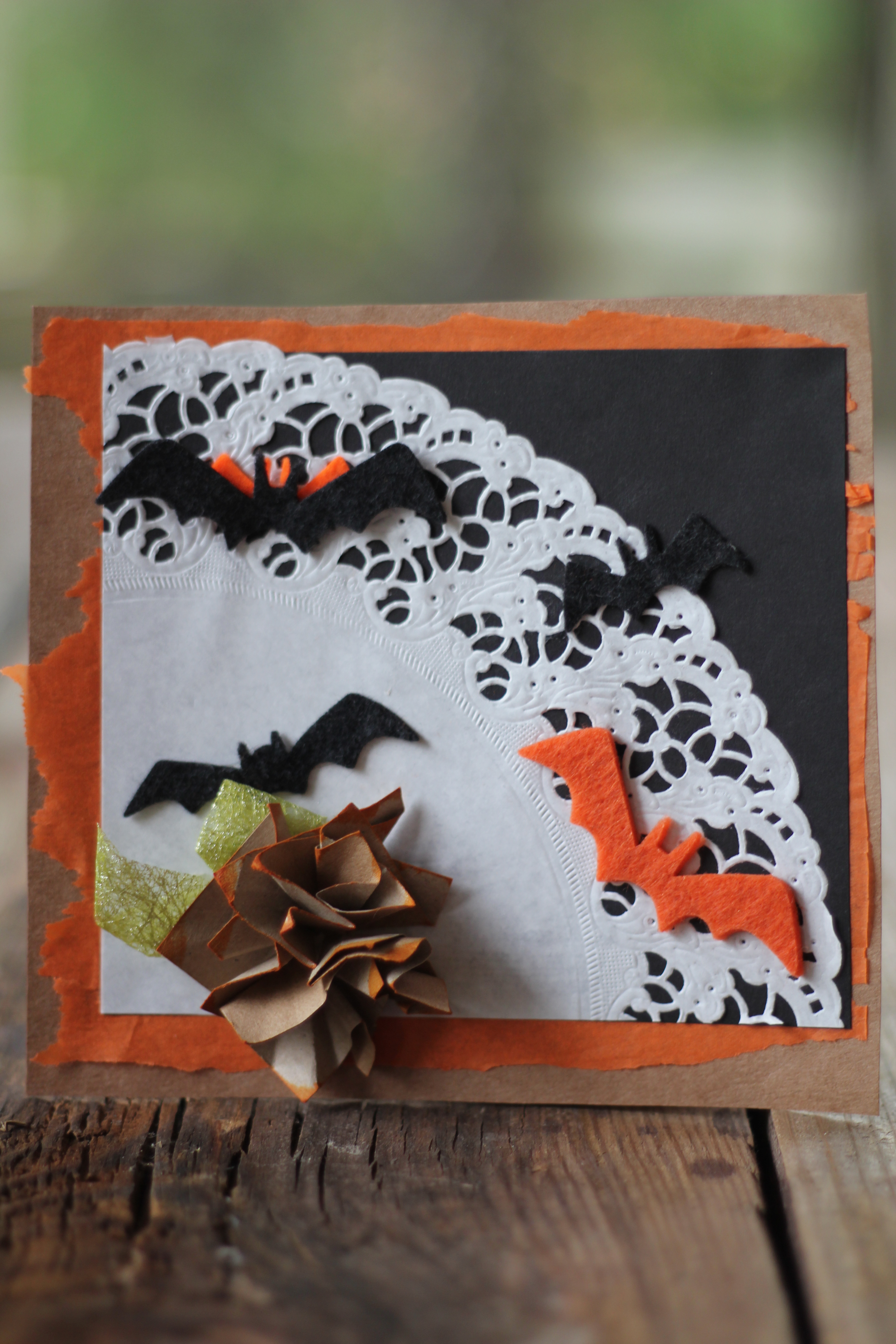 Oktober månadsbladet pryds av roliga fladdermöss i filtyg. Fladdermössen är klippta med Sissix stans. Det går även fint att klippa på frihand ur filttyg. Bakgrunden består av kakpapper och svart kartong. Blomman är gjord av förpackningsmaterial, vikt och skruttat. Kanterna är behandlade med orange färg.
