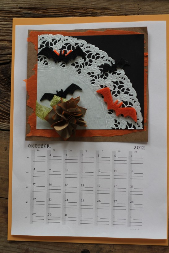 Lokakuun kuukausi sivua koristaa hauskat lepakot. Huovasta leikatut lepakot voi leikata saksilla, mallin lepakot on leikattu Sissix leikkurilla. Taustana toimii pala kakkupaperia ja musta kartonki. Kukka on taiteltu pakkausmateriaalista. Reunat on käsitelty oranssilla musteella.