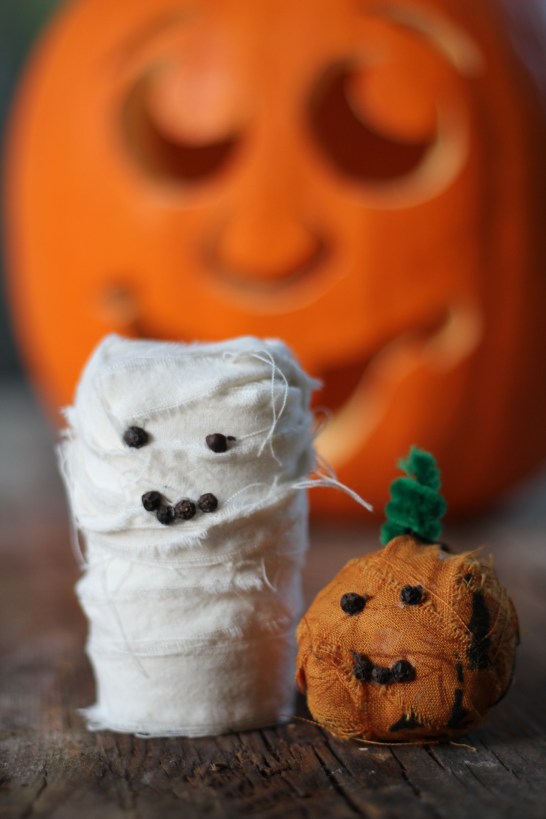 Halloween och ruskiga pyssel. Leta reda på en tom pappersrulle och en trasig strumpa, lite tyg och pepparkorn. Vill du göra en stor mumie kan du använda en vedklabb som stomme.