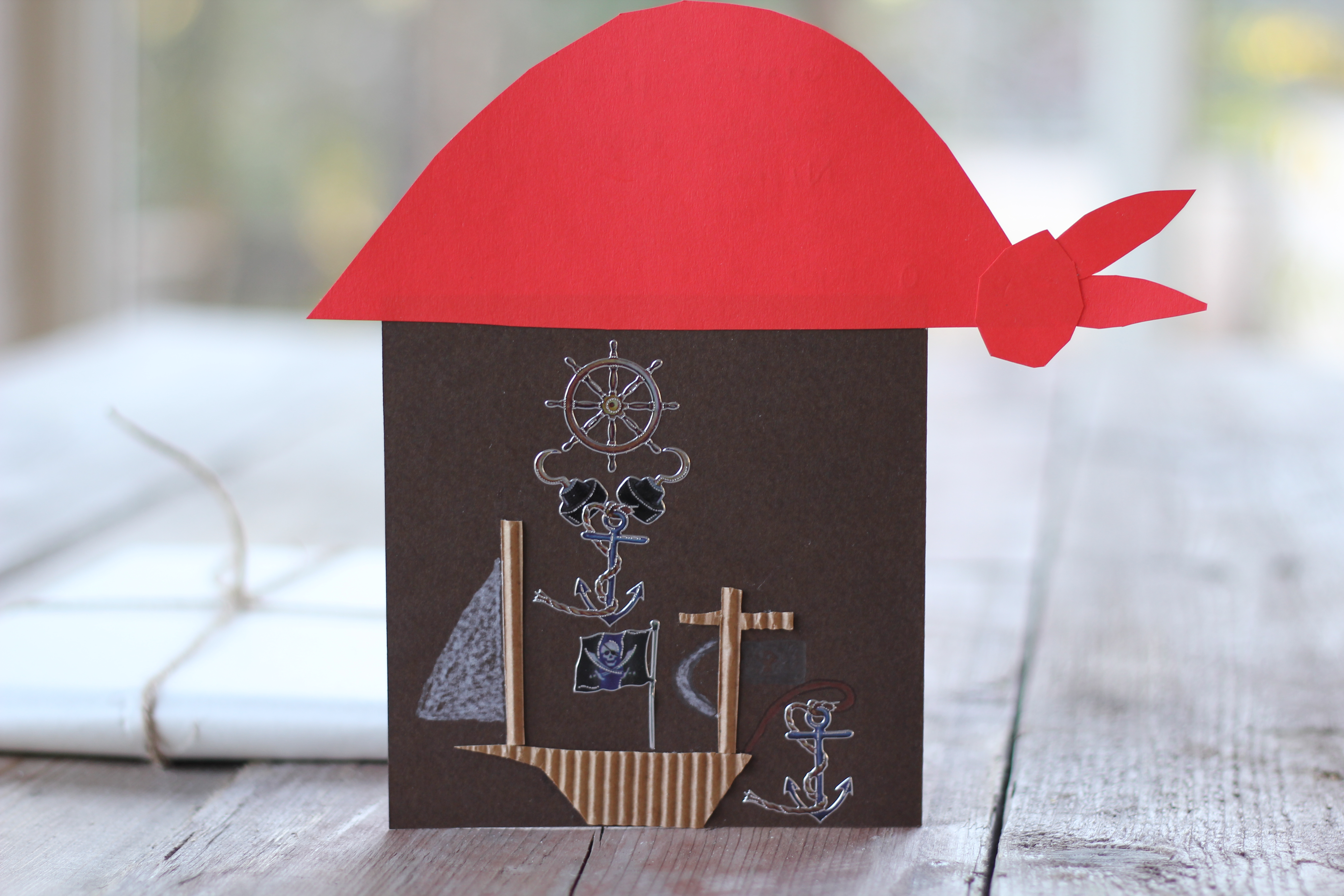 Gör så här: Klip en ”rövarduk” av den röda kartongen och limma på kortet. Klipp ut et skepp av paff och limma fast. Dekorera med segel och ev.klistermärken.
