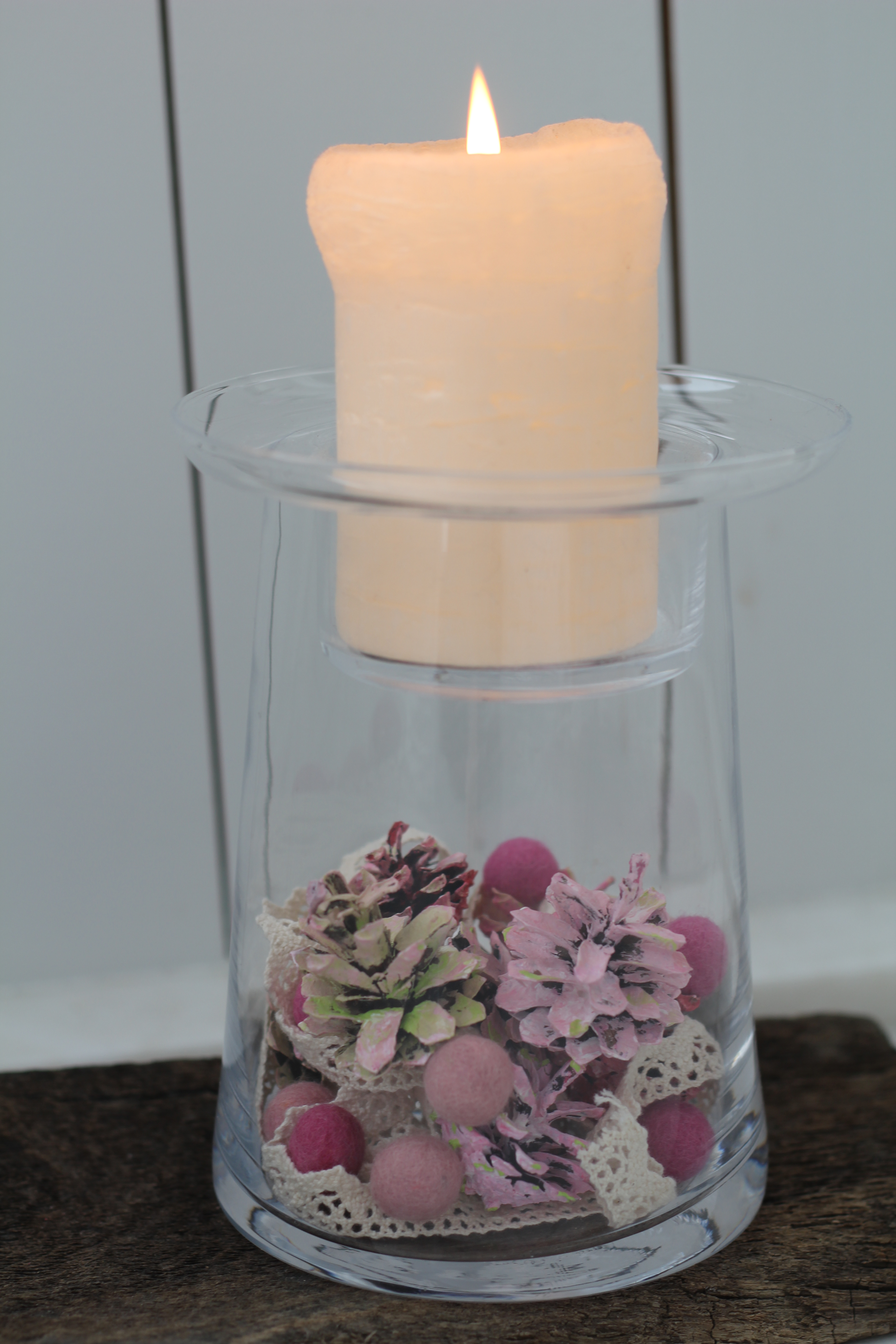 Ystävänpäivä lähestyy vauhdilla. Perinteisin koriste on sydämen muotoinen. Kokeilimme erilaista lähestymistapaa. Pidimme perinteiset ystävänpäivävärit mutta koristeena käytimme maalattuja käpyjä, pitsinauhaa sekä huopapalloja