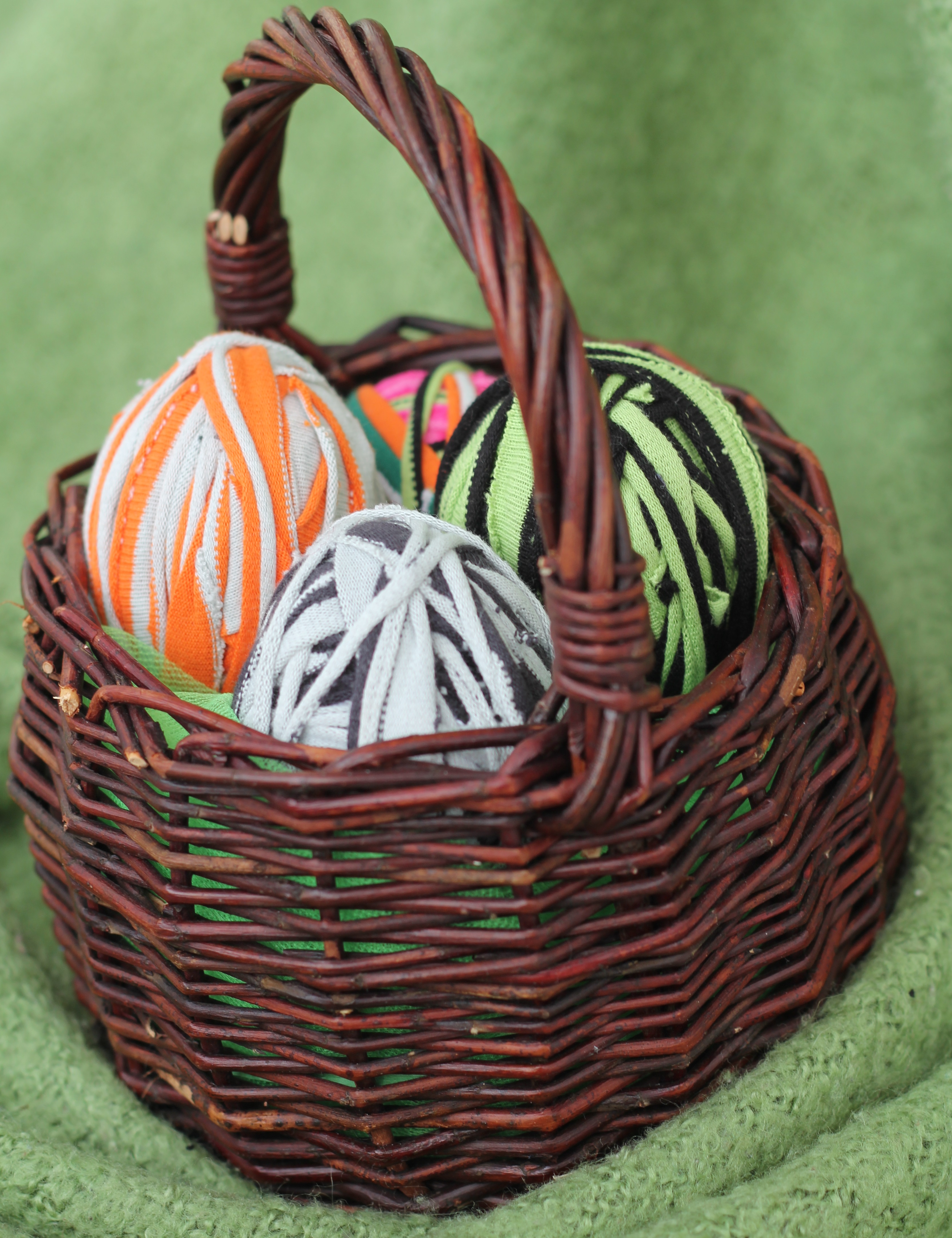 Gör så här: Knyt strumpan till en hård knut och vik över resterande material. Klipp remsor av tyget. Vira tygremsorna runt strumpbollen, tätt,tätt. Vik in ändarna under föregående remsa. Här behövs inget lim. Enklast går det med trikå.