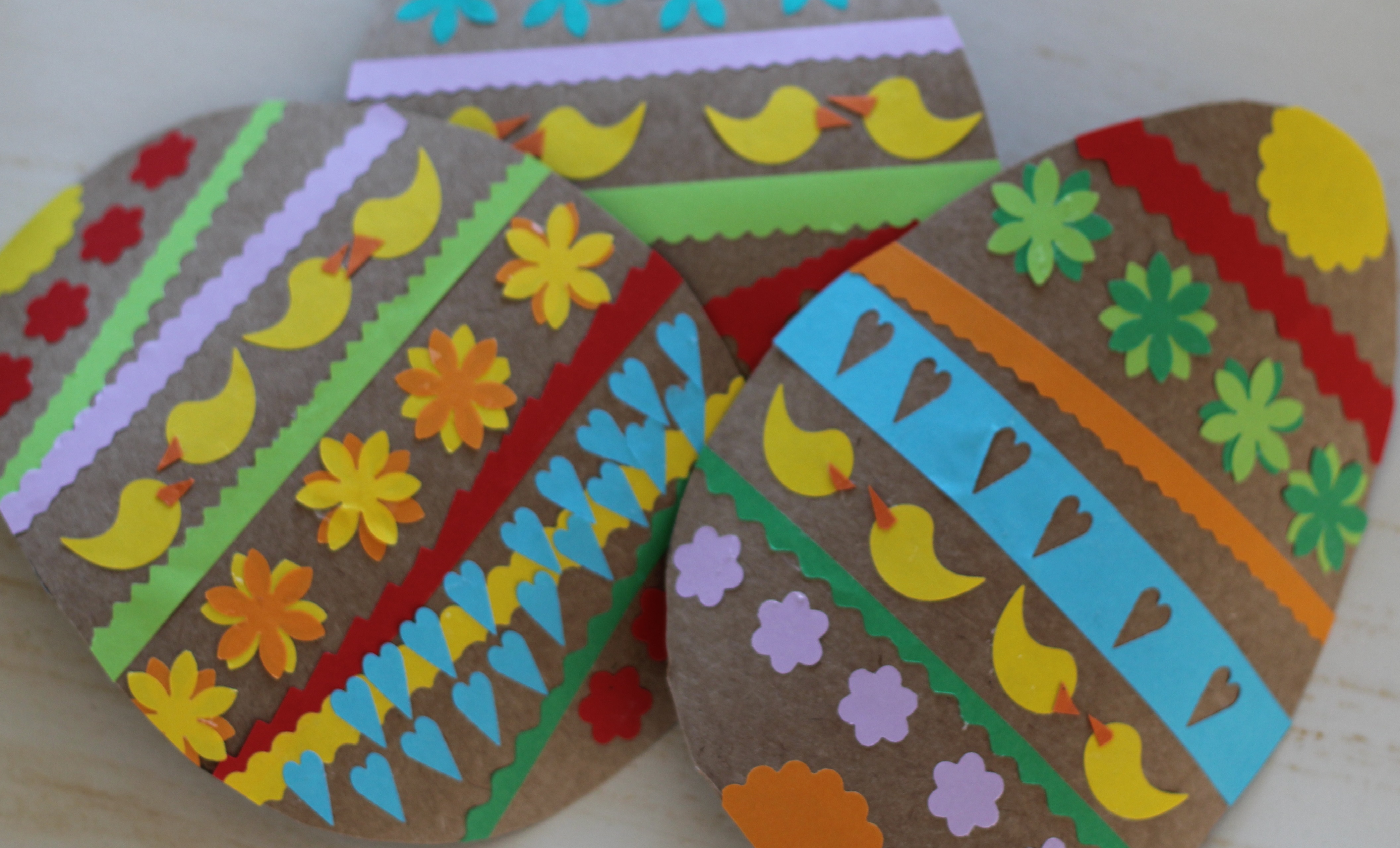 Gör så här: Rita ett ägg på kartongen och klipp ut. Dekorera med utstansade figurer.