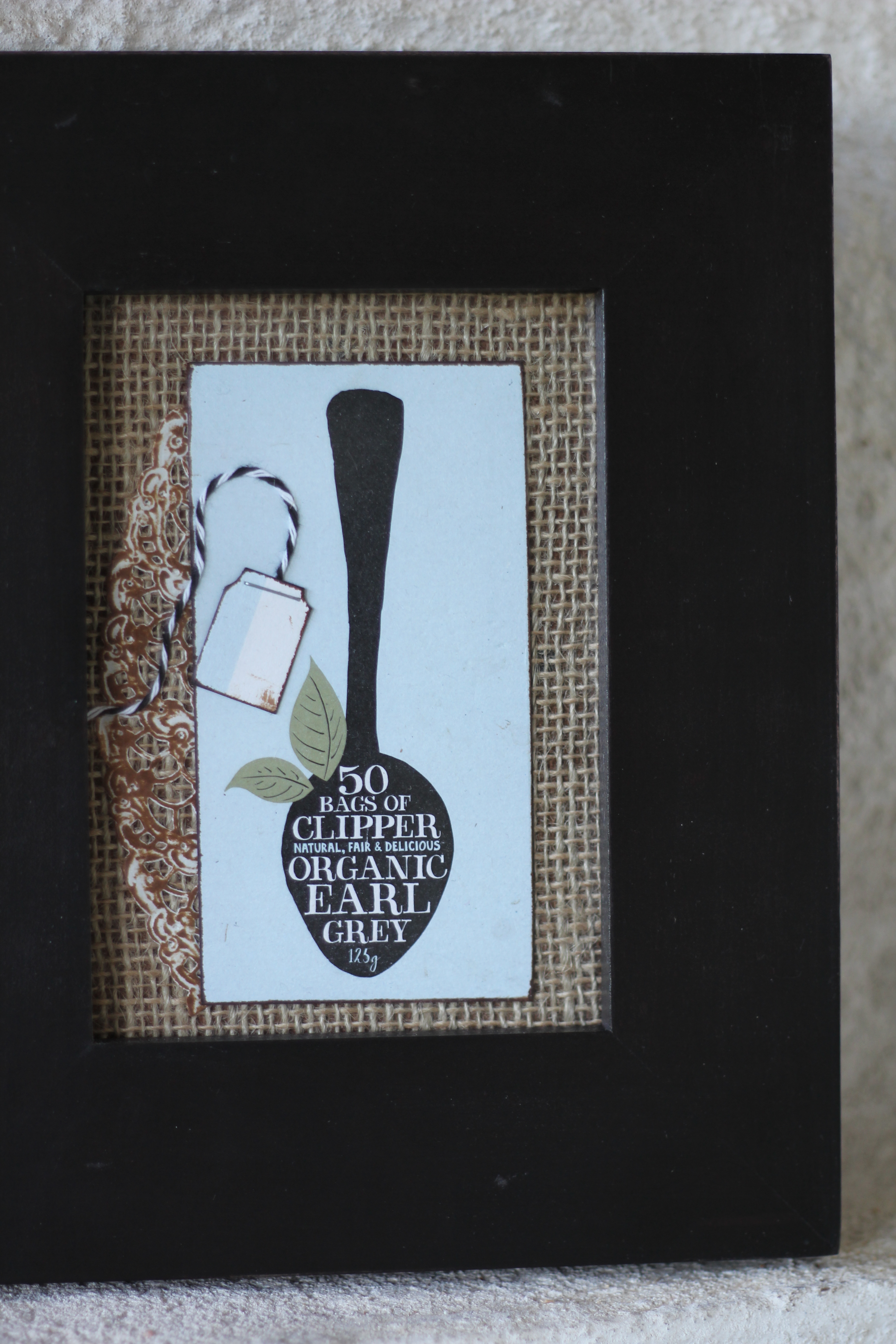 Gör så här: Riv eller klipp ut bilden du vill använda. Jag använde mig av kortsidan på förpackningen, och svärtade kanterna med brun stämpeldyna. Kakpappret är också behandlat med brun stämpeldyna och vikt så att enbart den dekorativa kanten syns. Klipp en bit av säckväven som passar in i ramen, lägg på bilden samt kakpappersremsan. Jag klippte till en liten tepåse dekoration av kartongen. Klipp ut en liten bit av kartongen, svärta kanterna och häfta fast en snörstump. Rama in eller limma på kortbotten.