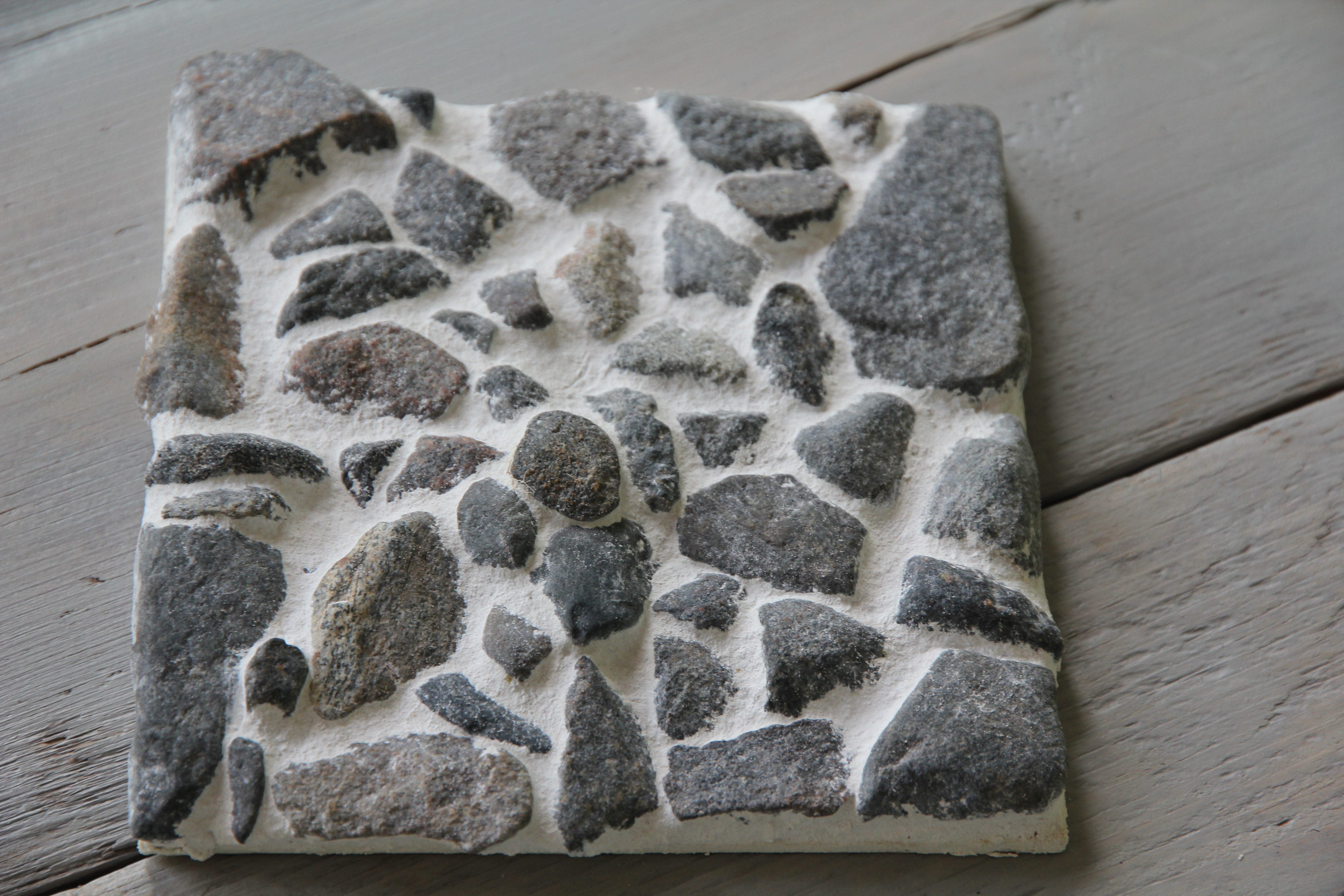 Gör så här: Börja med att lägga ut stenarana på skivan och se hur de passar ihop. Limma fast stenarna med hobbylim. Låt torka. Blanda fogmassan enligt anvisningen på paketet. Sprid ut fogmassan med en gummispackel och se till att massan hamnar mellan alla stenar. Låt torka i 30 minuter.Torka av överflödig fogmassa med en fuktig tvättsvamp eller trasa. Låt torka i ca 7 timmar. Putsa rent .