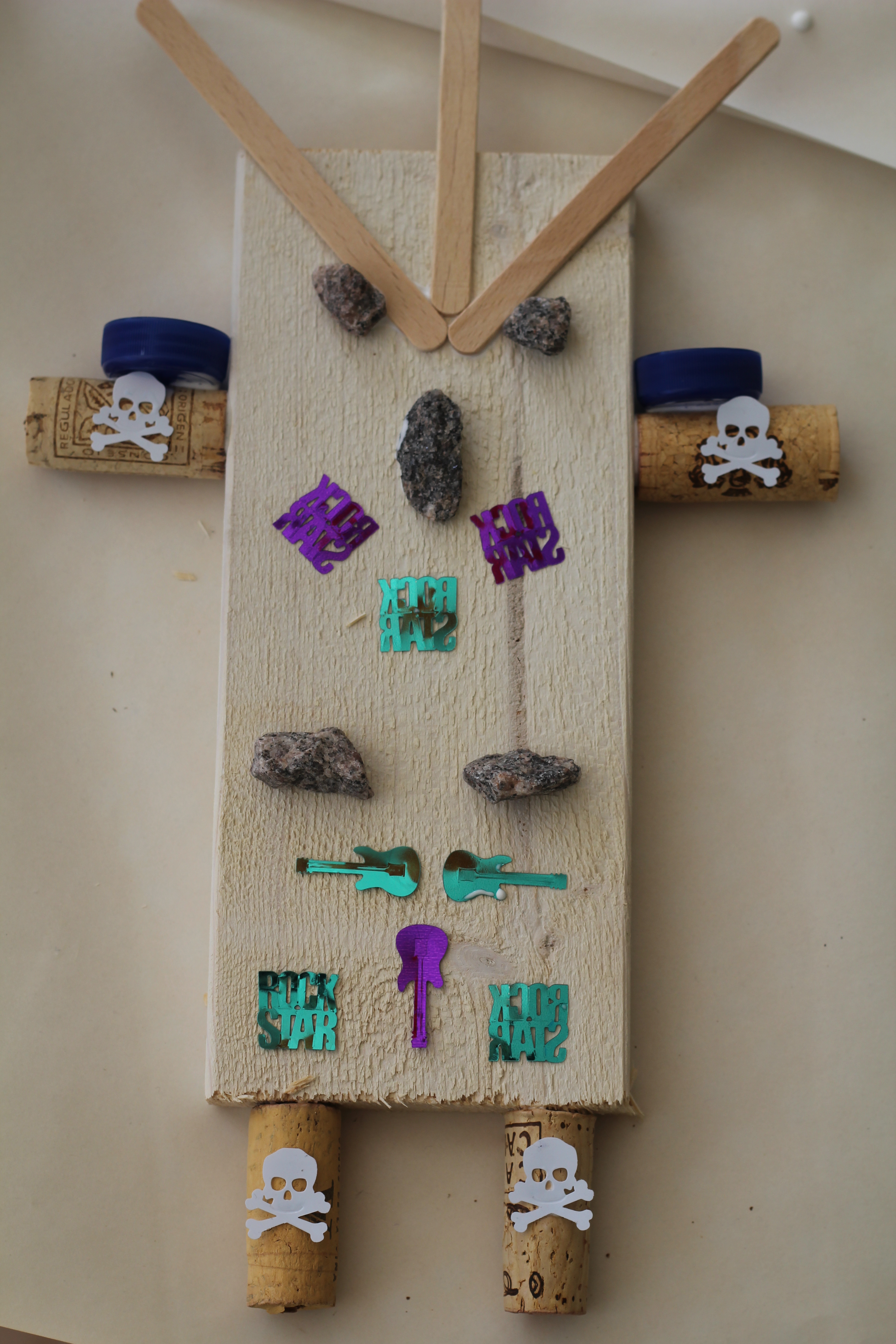 Kyllä lapset ovat kekseliäitä. Meillä lapset pyysivät lankunpätkiä, korkkeja, jätskitikkuja, kiviä sekä koristeita ja liimaa. Siisteintä oli edellisiltä synttäreiltä jääneet Rock´n Roll konfettihileet. Hämmentyneenä kyselin että mihin niitä tarvitaan-vastaus oli ” Me askarrellaan Robootteja!” Askarteluhetkestä kehkeytyi pitkä tarina ja iso lauma ukkeleita.Ja lukuisia supervoimia!! ”Roinan keruu siis jatkuu, toivottavasti kaapin kätköistä löytyy sopivia tarvikkeita seuraavaa projektia varten.