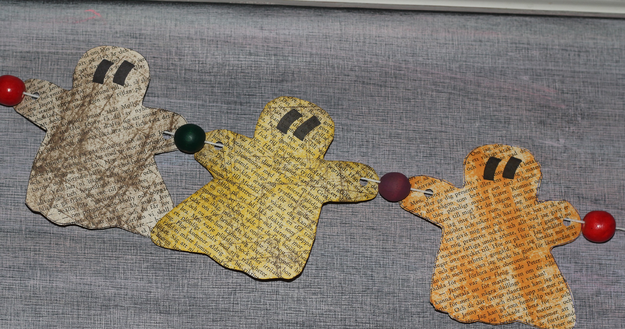 Material: spökform, boksidor eller en gammal tidning, pennor, hålstans, pärlor, sax och snöre.
