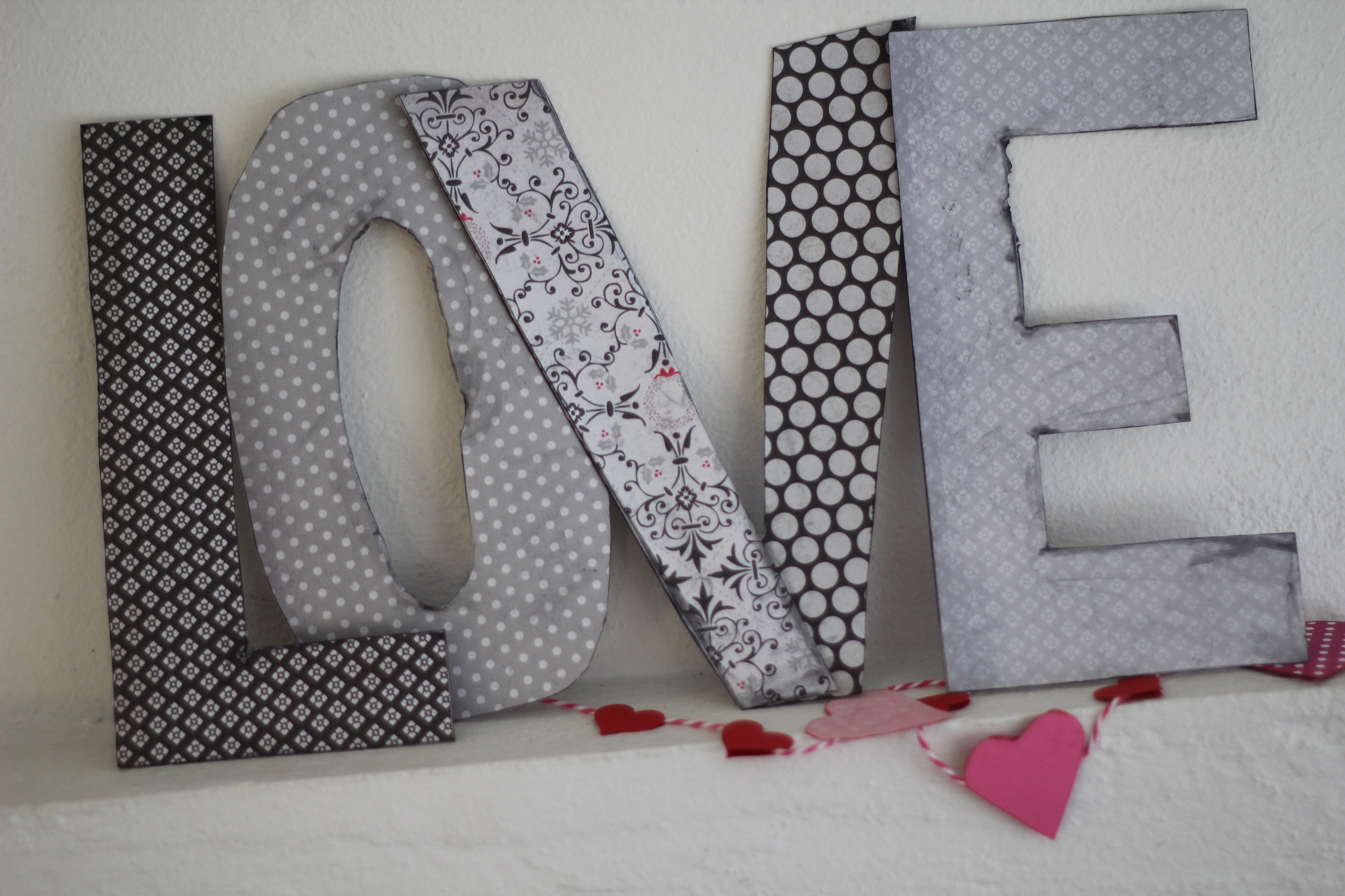 Tee näin: Tee kirjainmallit kartongista ja leikkaa irti. Päällystä molemmilta puolin paperilla ja käsittele reunat mustalla tussilla tai leimasin tyynyllä.