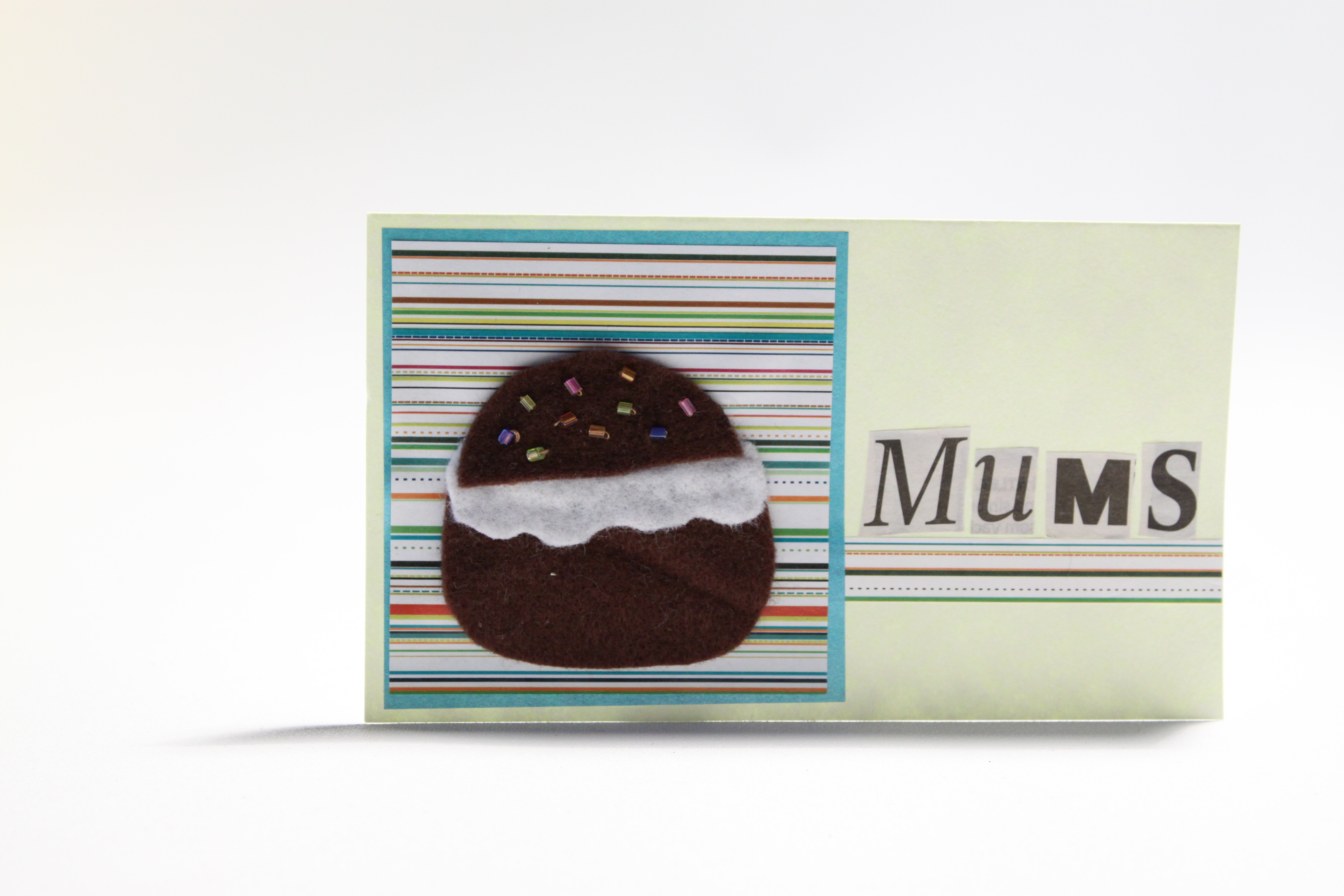 Du behöver: Kortbotten eller en bit kartong, randigt papper, brunt och vitt filttyg, lim, små pärlor och sax. En tidning där man kan hitta bokstäverna M, U, M, S.
