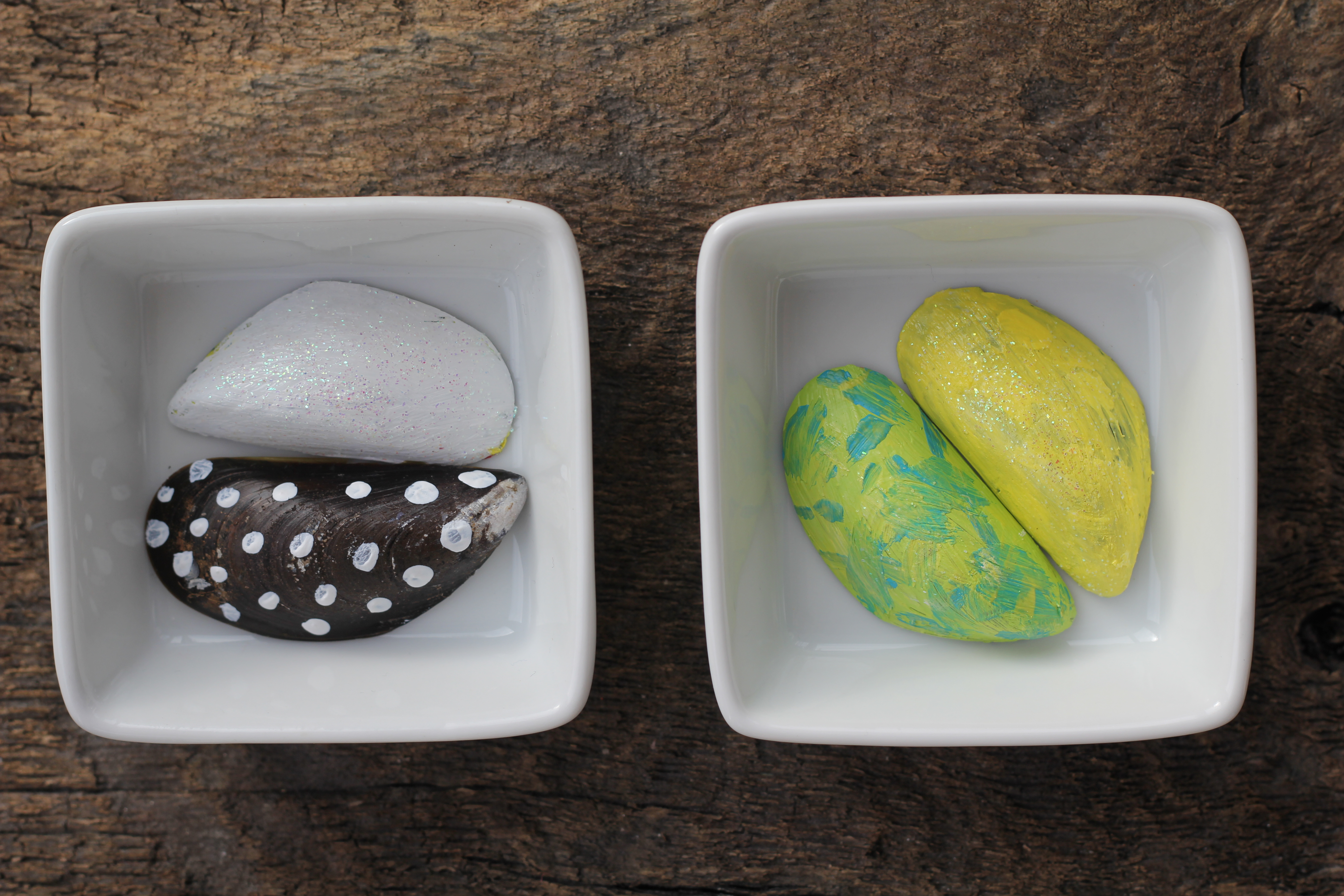 Gör så här: Tvätta musselskalen och låt torka. Måla skalen och låt torka. Dekorera med en annan färg eller med glitter. Låt torka.