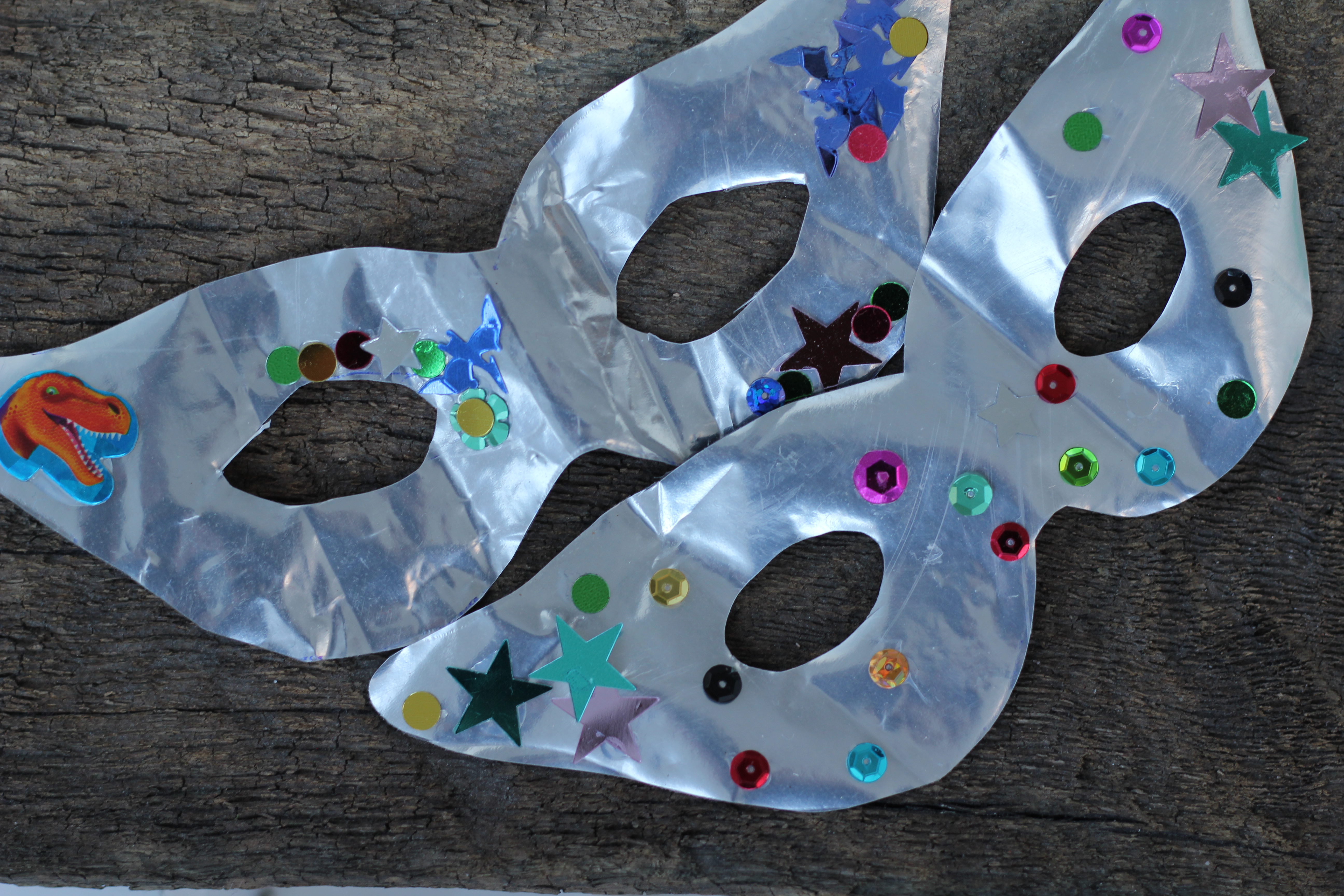 Yhdestä kahvipaketista saat 3-4 naamaria. Mallin voi ensin piirtää paperille ja leikata irti. Piirrä naamarin ääriviivat kahvipaketin hopeiselle puolelle ja leikkaa naamarit paketista. Koristele esimerkiksi paljeteilla ja höyhenillä. Anna kuivua. Tee reiät nauhaa tai kuminauhaa varten. Mittaa sopiva pätkä nauhaa ja solmi naamaariin. Naamarin voi myös kiinnittää pitkään pilliin tai puutikkuun.