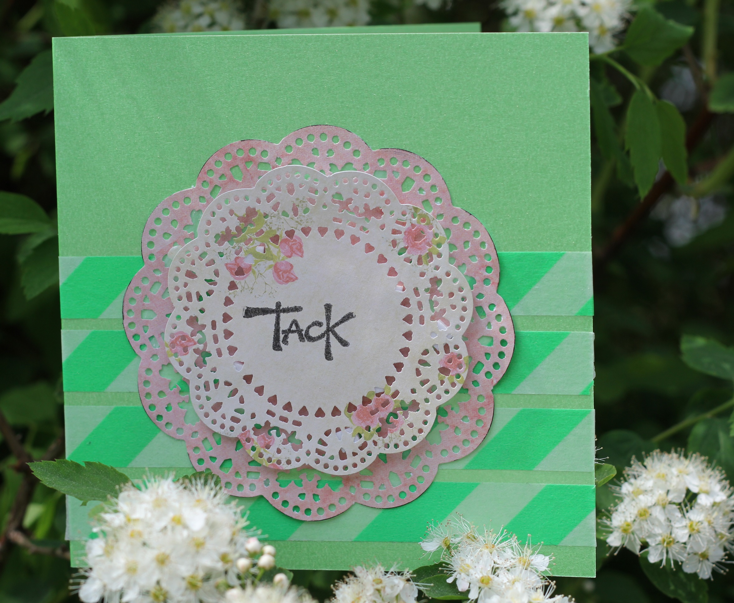 Det gröna kortet har fått ränder av washitape. Sedan är TACK stämplat på en liten spetsrundel och fäst på en större spetsrundel.