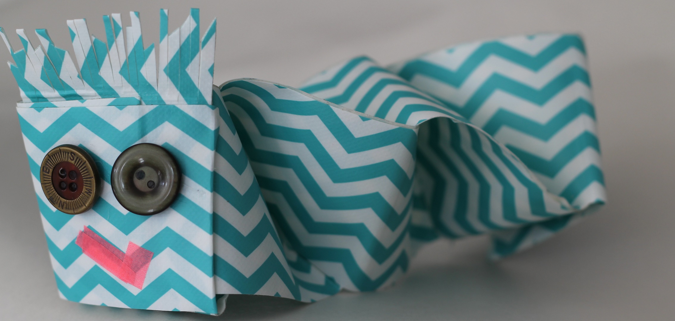 Du behöver två remsor tejp, ca 50 cm långa. Mät upp och vik båda remsorna på hälft och limma ihop, så får du två dubbelsidiga remsor. Börja genom att lägga remsorna så de bildar ett L. Remsorna möts i vinkeln. Fäst med en bit duct tape. Nu gäller det att vika remsorna över varandra då man får en larv. Då man kommer till sista vikningen kan man fästa remsorna med starkt hobby lim eller en bit duct tape. Limma knappar till ögon och tejpa eller rita en mun.