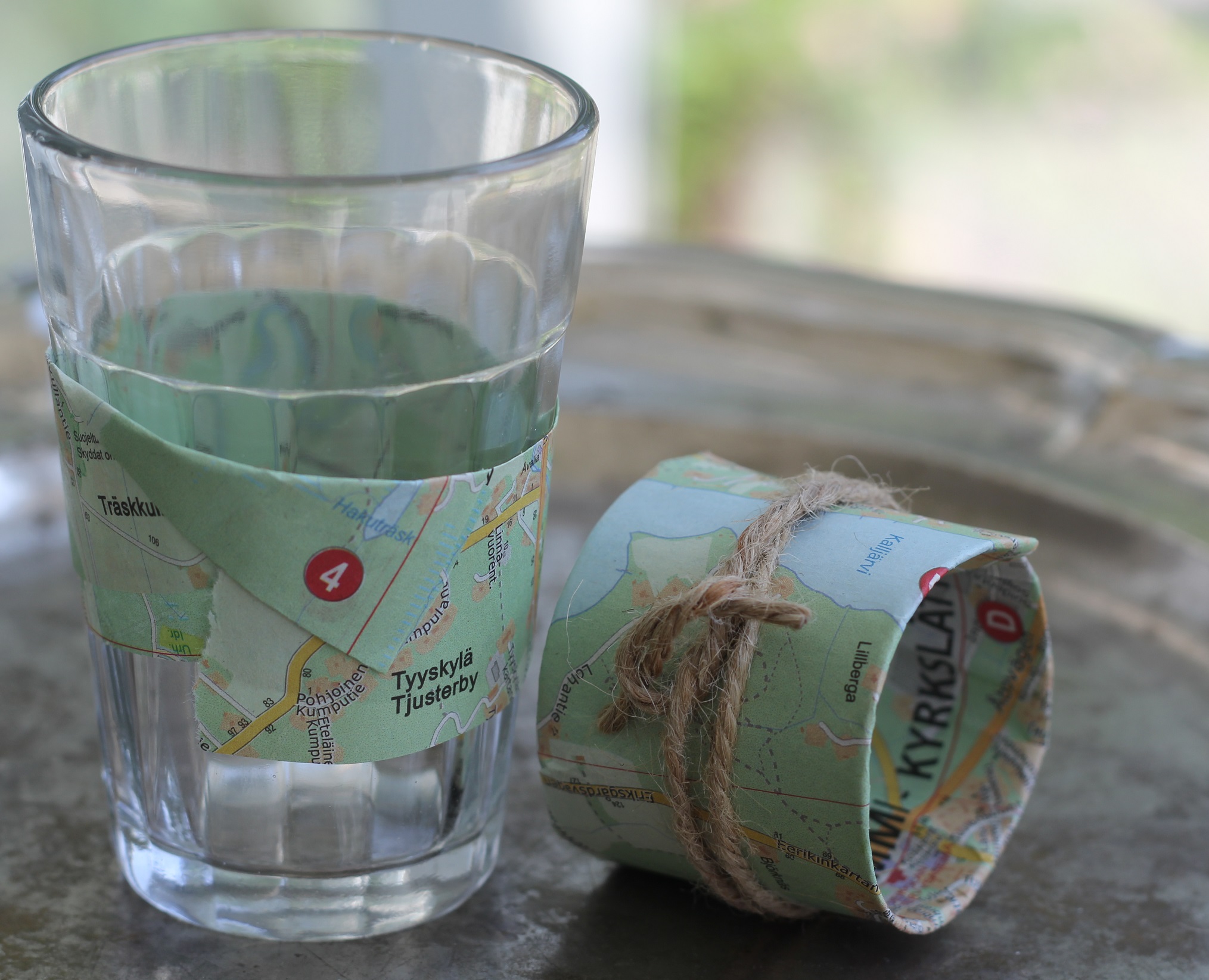 Dekorera glasen med ”kart-strimlor”, fäst med papperslim. Matchande servettringar får man genom att klä en stump pappersrulle med kartor.