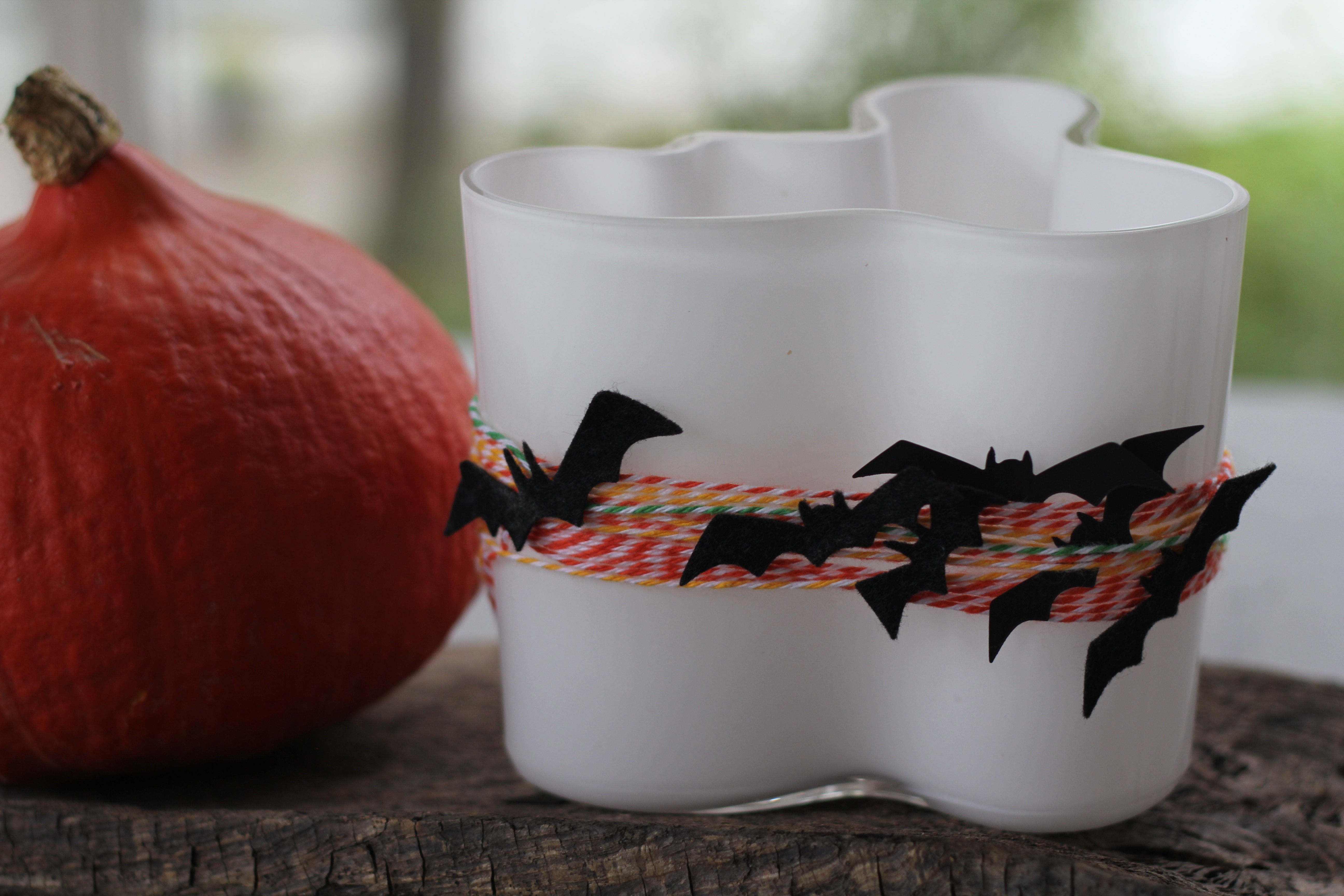 Valkoinen Aalto maljakko sai uuden elämän. Maljakon ympäri on kieputettu eriväristä Bakers Twine nyöriä ja koristeltu huovasta leikatuilla lepakoilla. Tuunattu versio pääsee paraatipaikalle Halloween juhlaan. Maljakko täytetään hurjilla silmämunilla ja limaisilla karkkimadoilla.