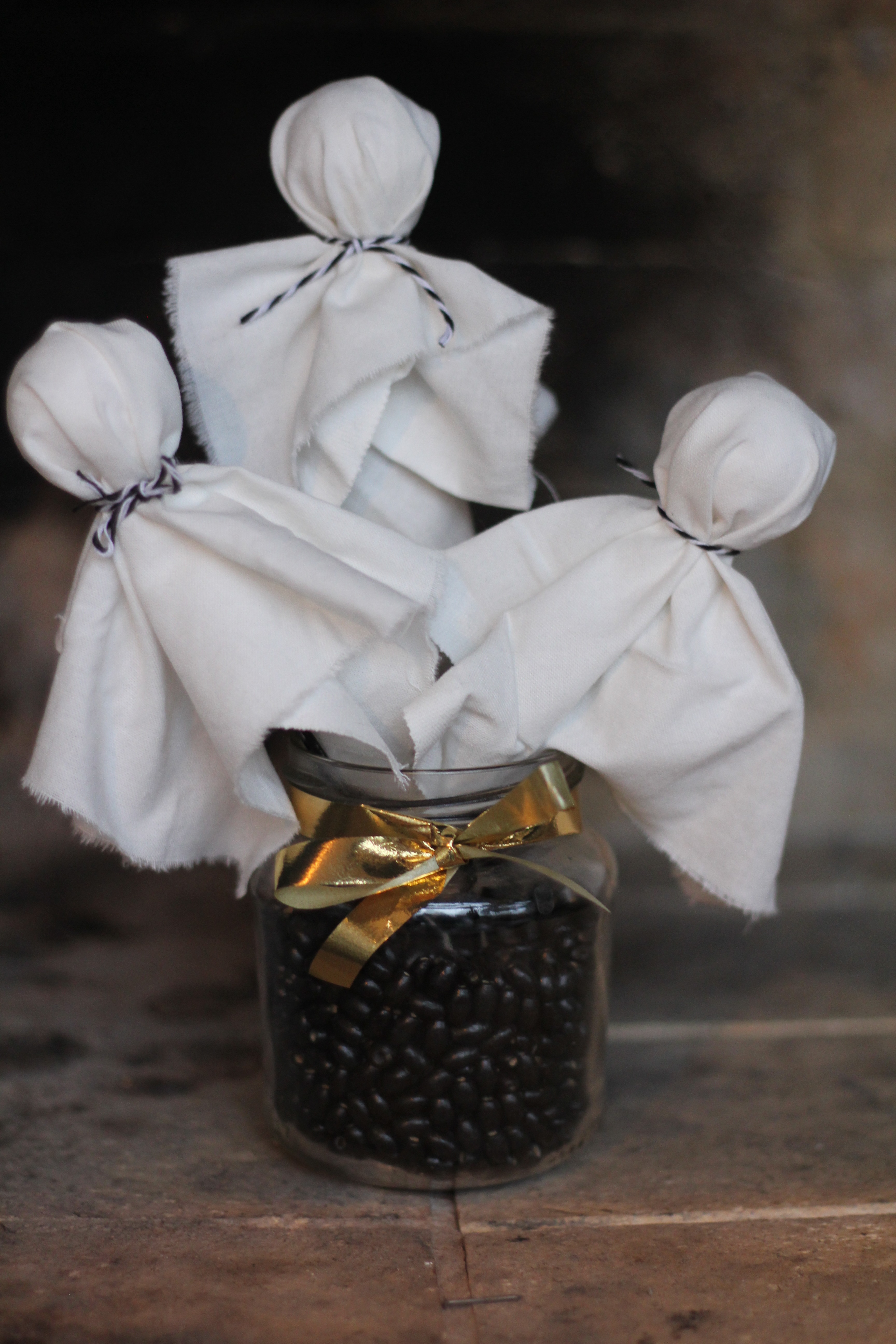 Viime hetken Halloween askartelu syntyy hetkessä. Hauskat haamut voi asetella lasipurkkiin jossa on mustia helmiä. Laita led kynttilä purkin taakse. Käytä tikkareita tai grillitikkuja ja massapalloja.