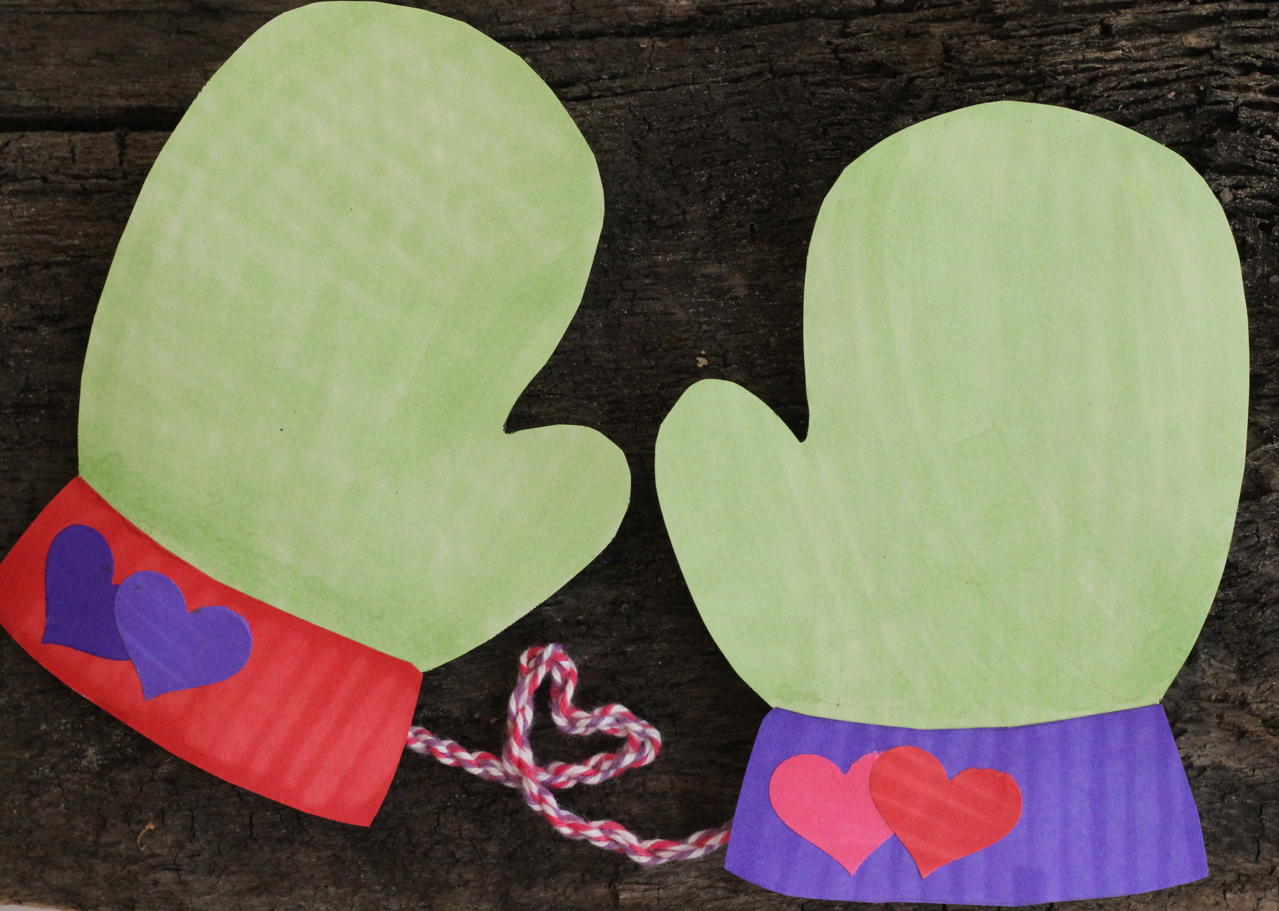 Gör så här: rita upp ett par vantar på papper eller kartong. Som mall kan man använda sina egna vantar. Du kan lägga till olika färgers muddar på vantarna. Måla eller färglägg och dekorera. Du kan måla på båda sidor om du vill. Klipp ut. Du kan använda två olika färgers garn och tvinna ihop dem till ett snöre. Gör ett hål i vardera vante och knyt ihop vantarna med bandet.
