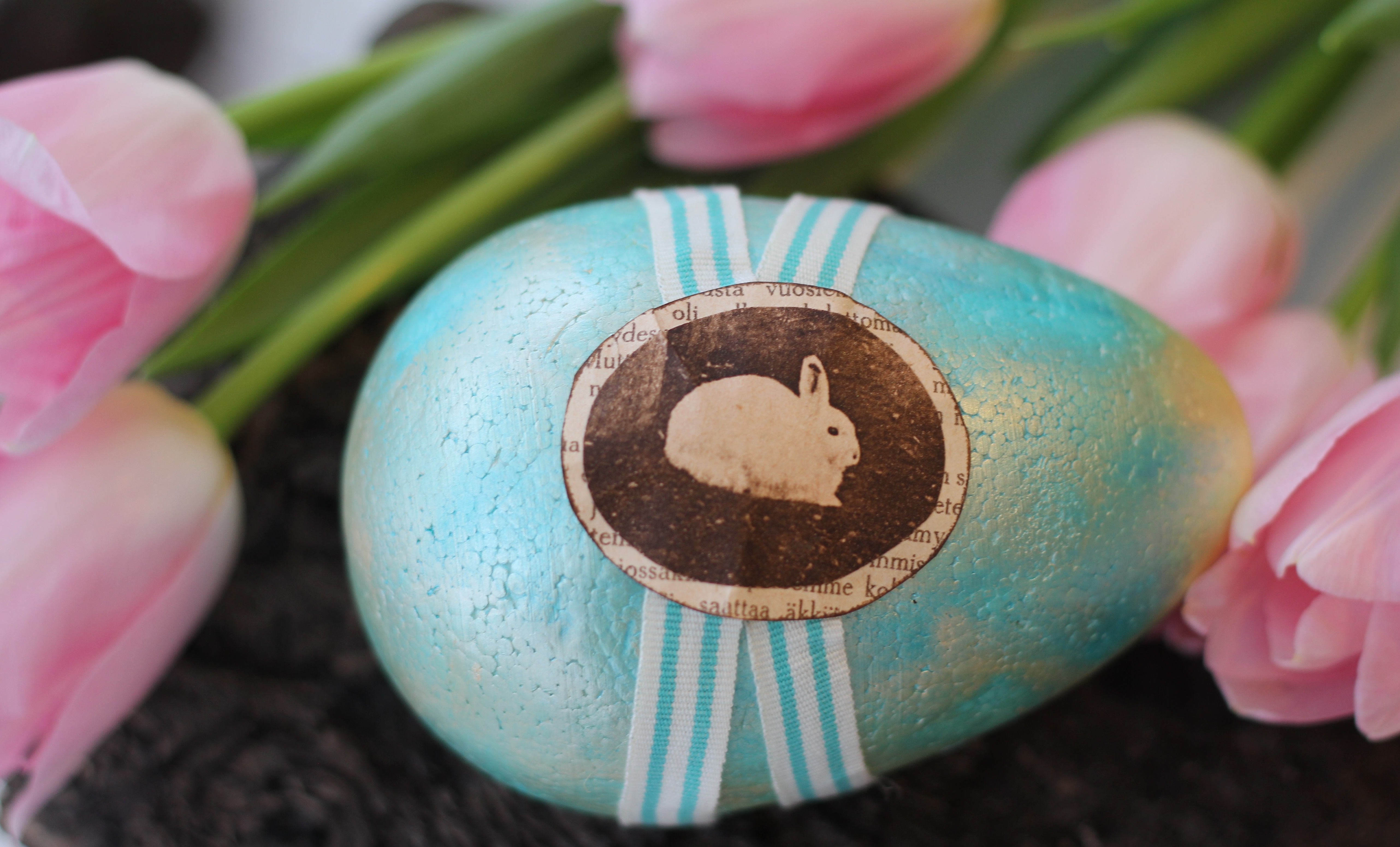 Njut av vårens färger och pyssla inför påsk. Frigolit ägget är målat med Inka Gold och dekorerat med en liten kanin från en gammal tidning.