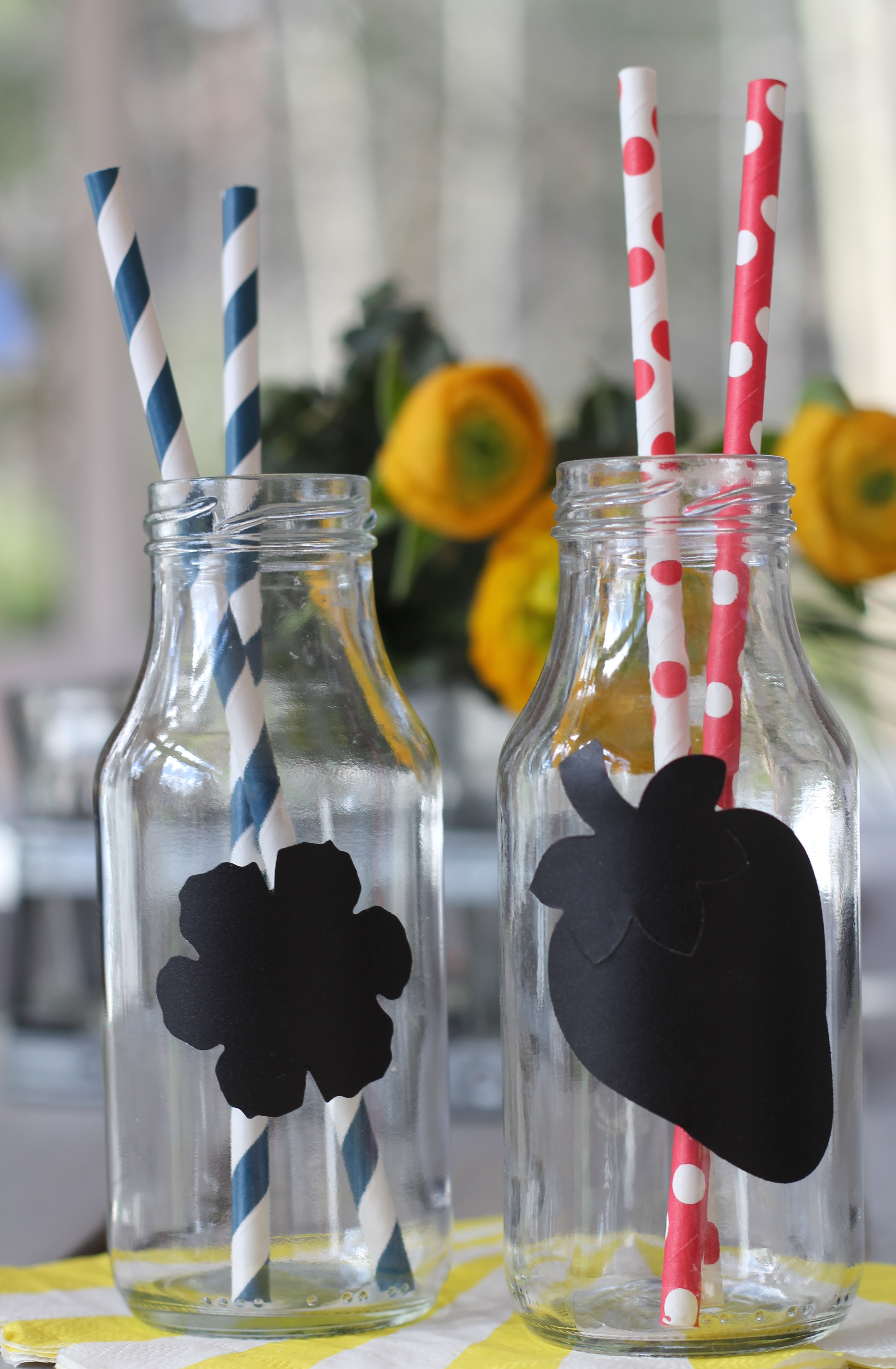 Smoothies är IN just nu. Enkelt att ha med till jobbet, mötet och som mellanmål till barnen. Nackdelen med köpt smoothie är flaskorna som blir kvar. Tvätta dem och låt dem bli en del av sommarens dukningar. Dekorera med figurer klipptra ur svart griffeltaveltejp. Skriv gästernas namn på flaskorna och dekorera med härliga sugrör av papper. Fint på brunchen!
