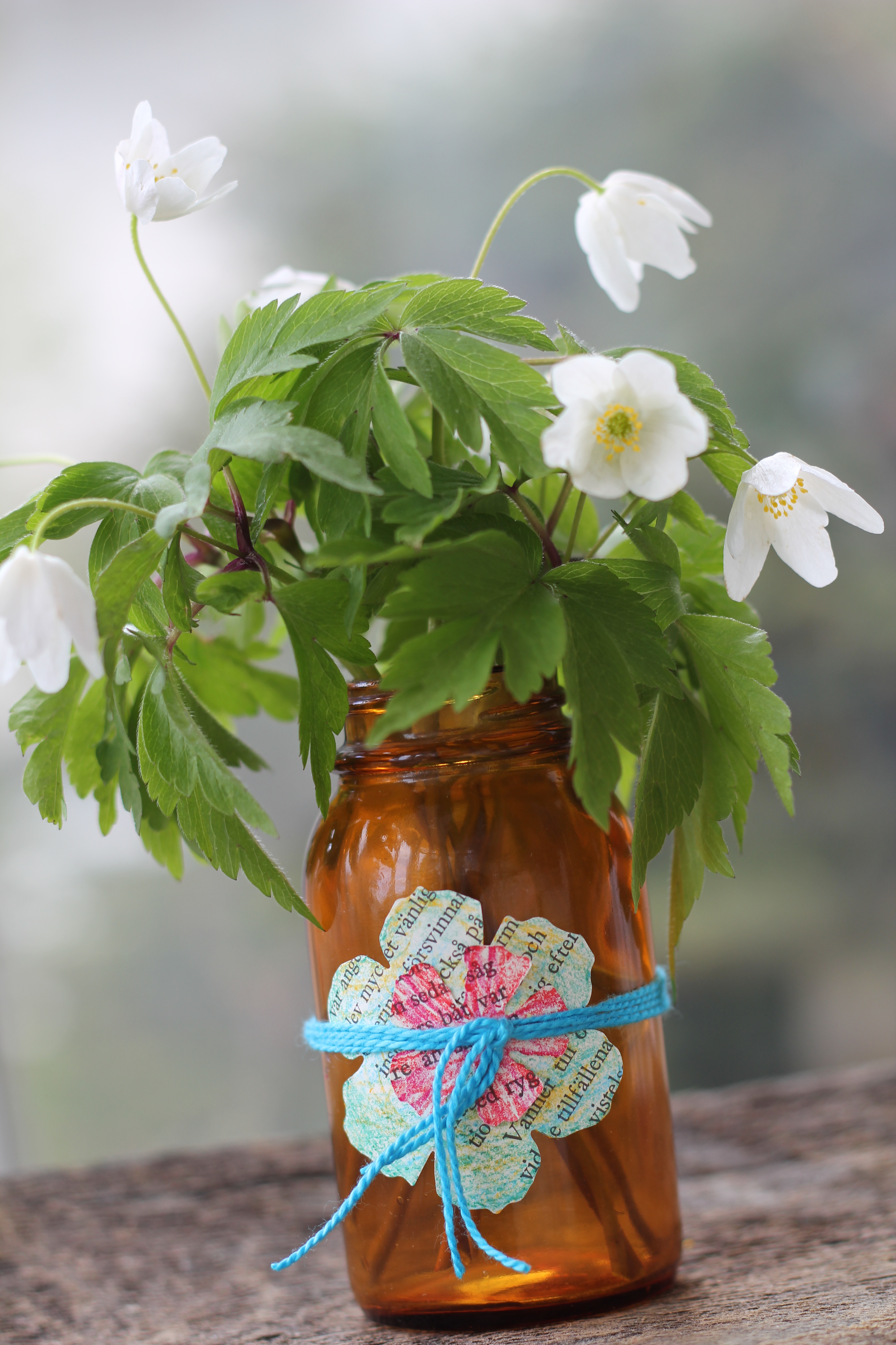 Poimi valkovuokkoja äidille. Maljakkona toimii vanha lääkepurkki. Purkin kylkeen on sidottu kukkasia puuvillalangalla. Kukkaset on leikattu rikkinäisestä kirjasta ja väritetty liiduilla.