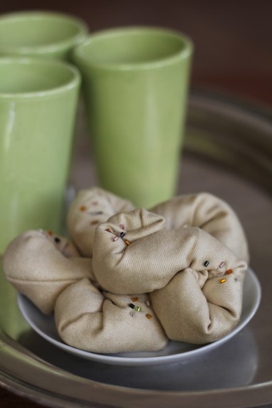 Tee näin: Leikkaa kankaasta noin 6cm leveitä ja 30cm pitkiä palasia. Ompele koneella tai käsin, ompele pitkät sivut sekä toisen pään. Käännä työ niin että saumat jäävät sisäpuolelle. Täytä pulla ja ompele kiinni täyttöaukko. Muotoile sahramipullaksi ja kiinnitä parilla pistolla. Koristele pienillä lasihelmillä.
